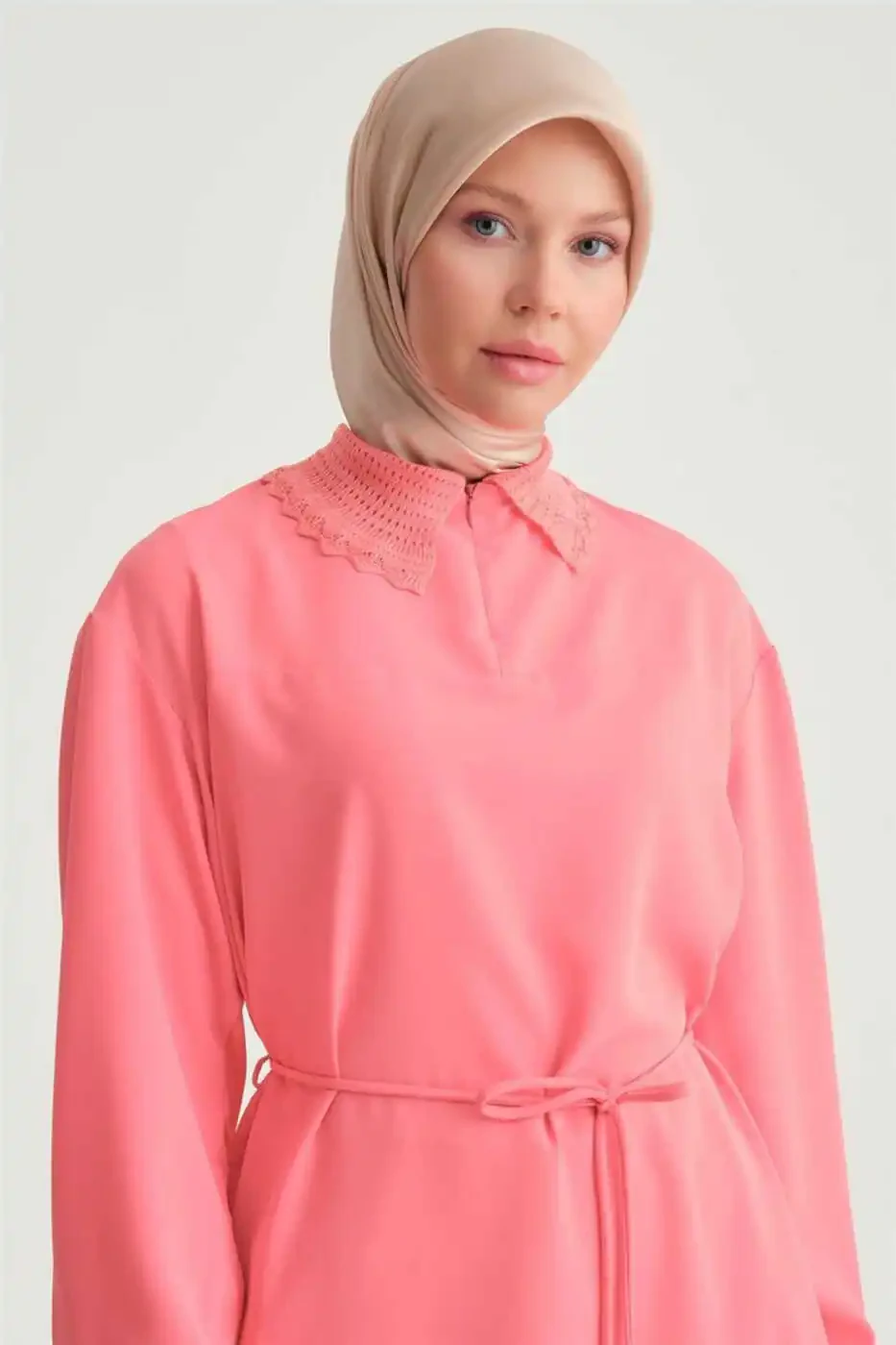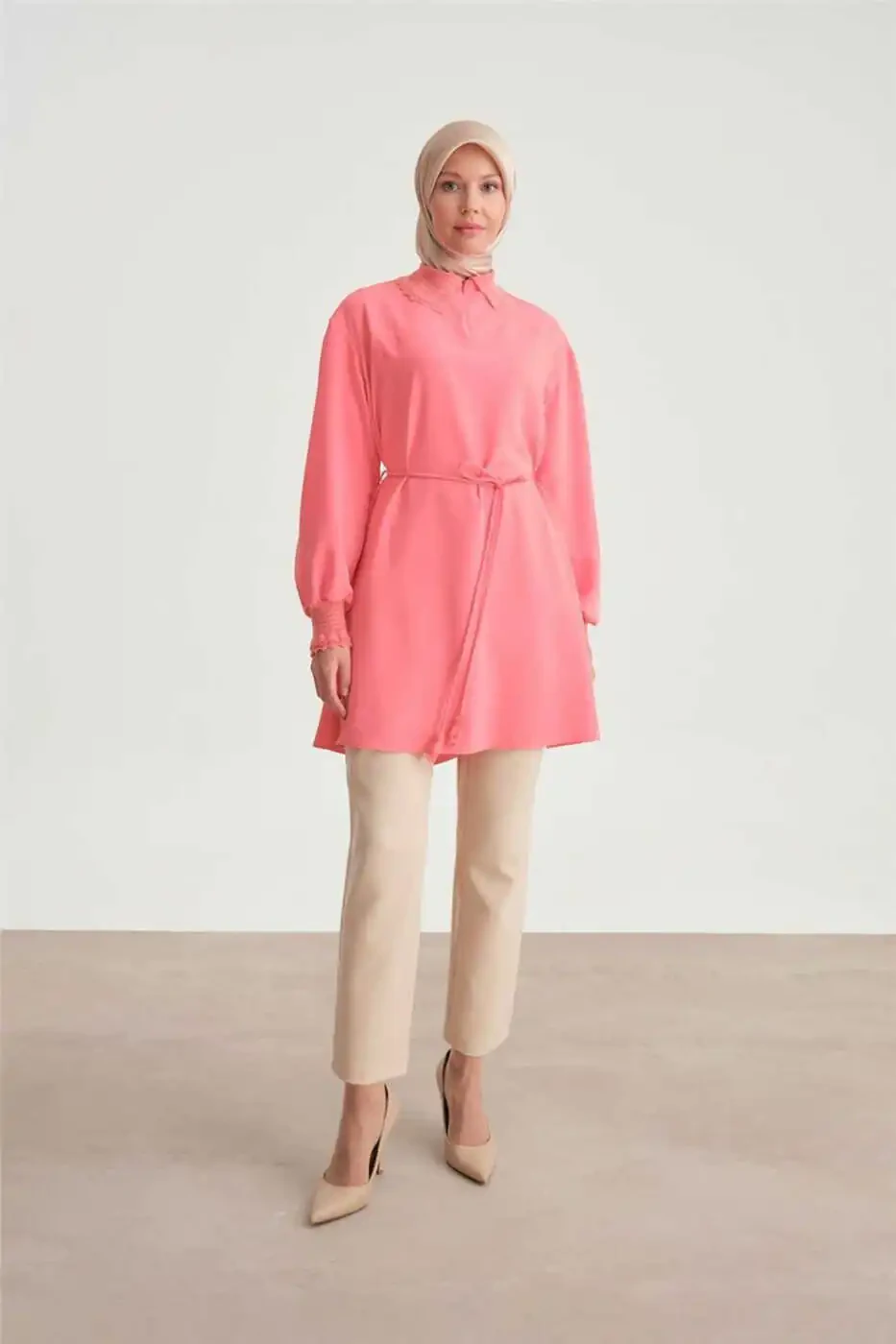 Exclusively designed for the modest fashion collection, this tunic combines elegance with the principles of modest dressing. The belt detail accentuates the waist, creating a feminine silhouette. The crew neck design adds a touch of sophistication, while the solid color option ensures effortless pairing. The woven fabric enhances durability, ensuring longevity. Its regular fit accommodates various body types, offering a perfect fit.