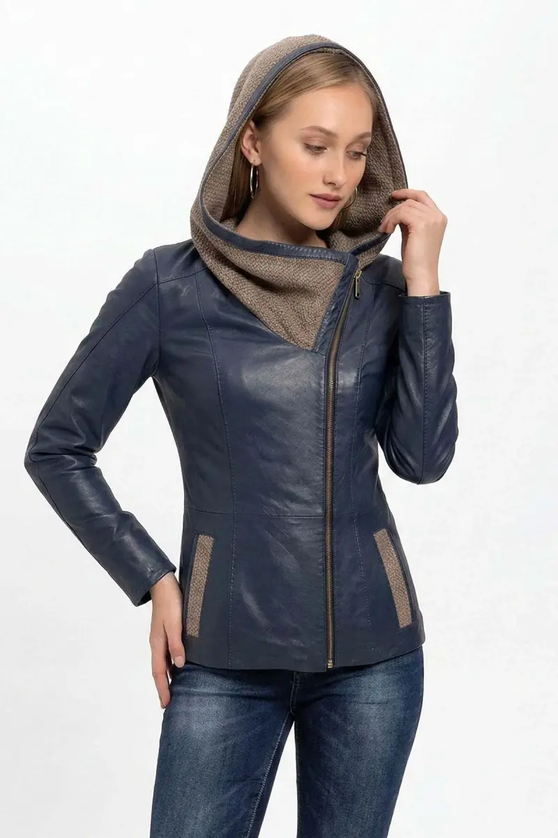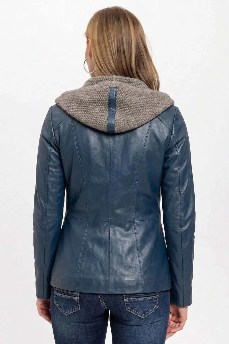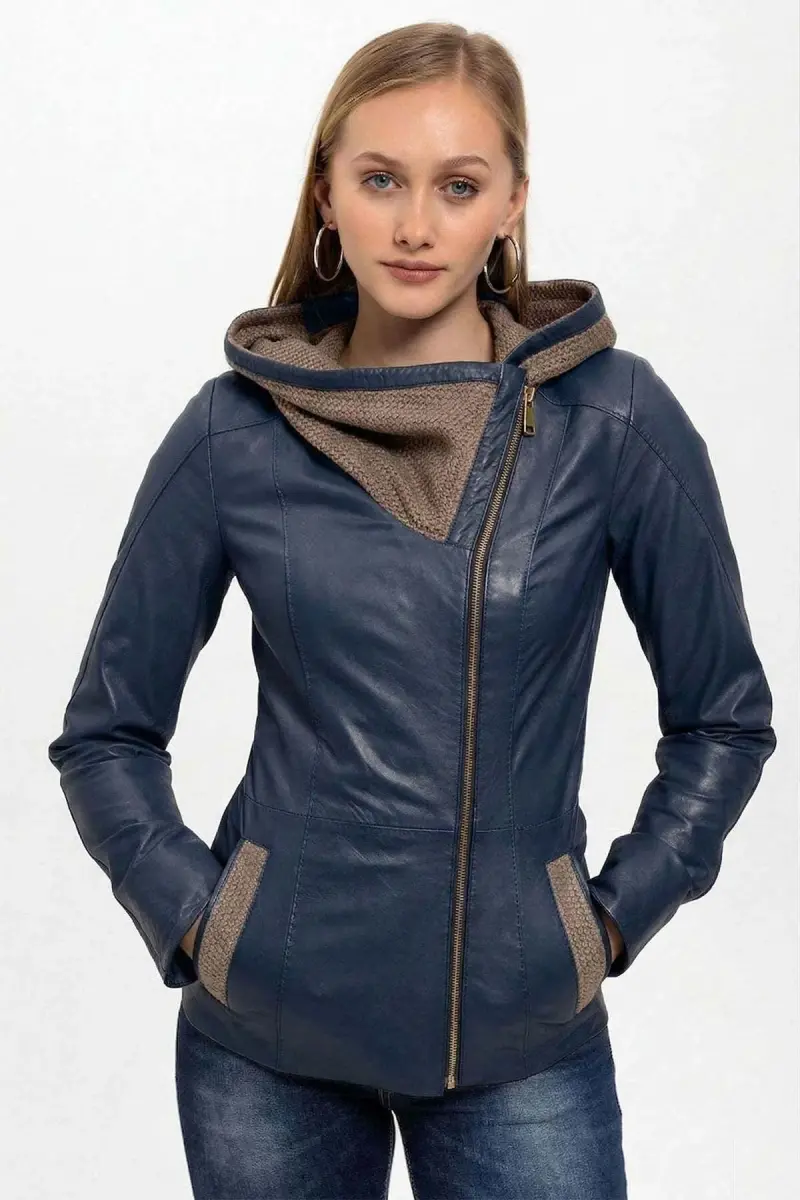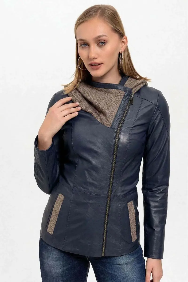 Lacivert Antonia Triko Kapüşonlu Kadın Hakiki Deri Mont-LACIVERT