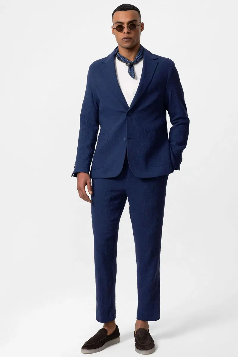 To‘q ko‘k Slim Fit naqshli o‘tkir yoqali kurtka