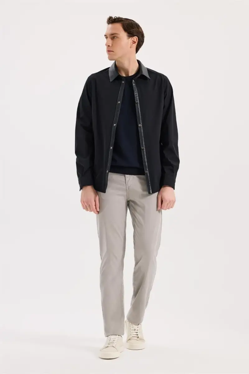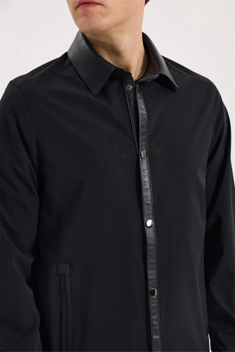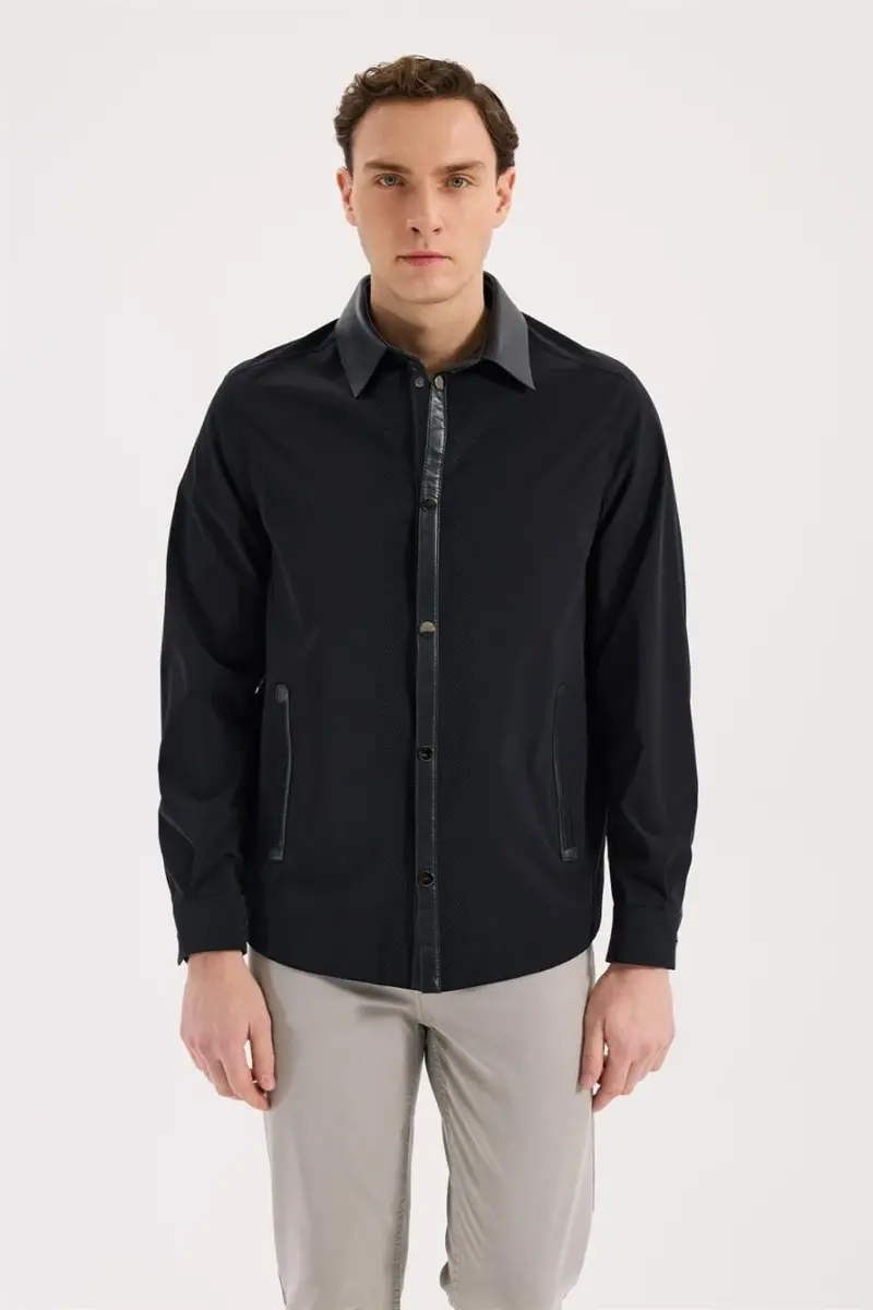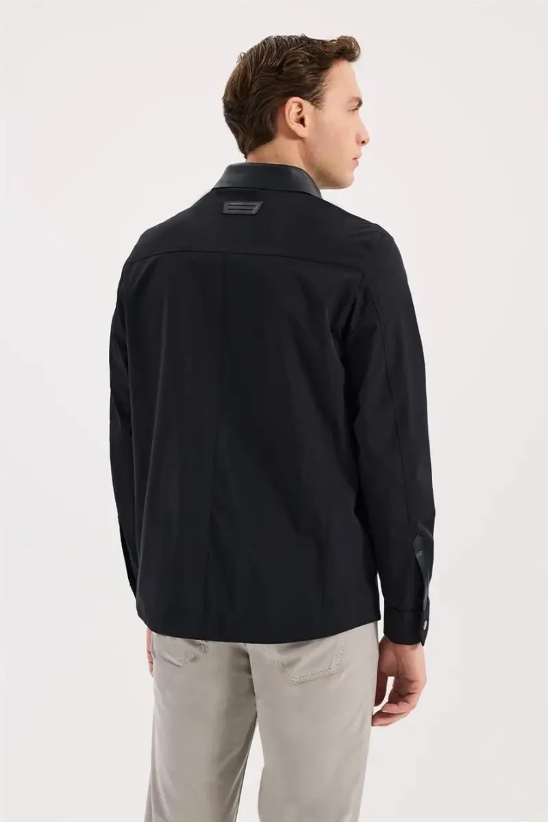 Lacivert Comfort Fit Bebe Yaka Hakiki Deri Detaylı Mevsimlik Spor Mont