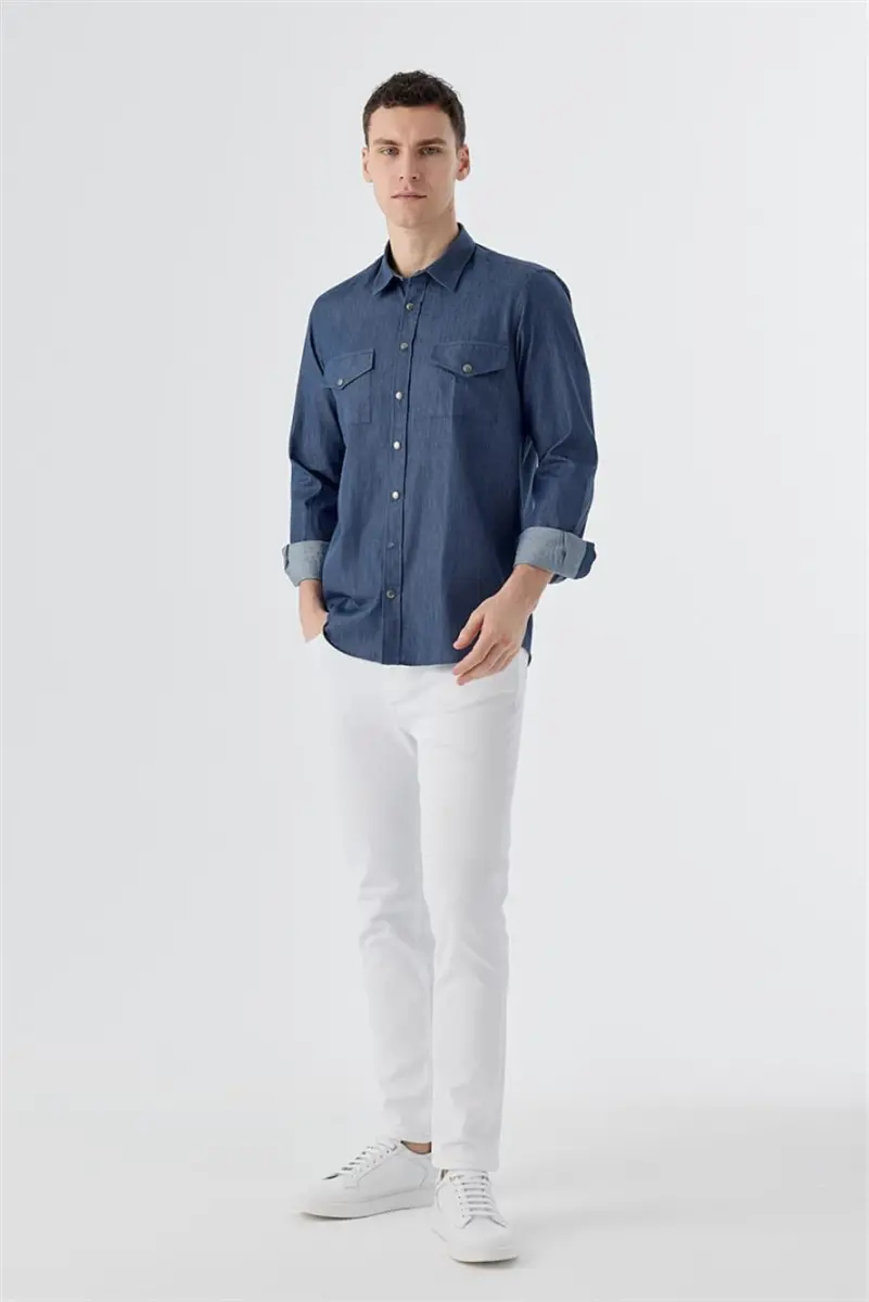 Lacivert Comfort Fit Cepli Çıtçıtlı %100 Pamuk Kot Gömlek