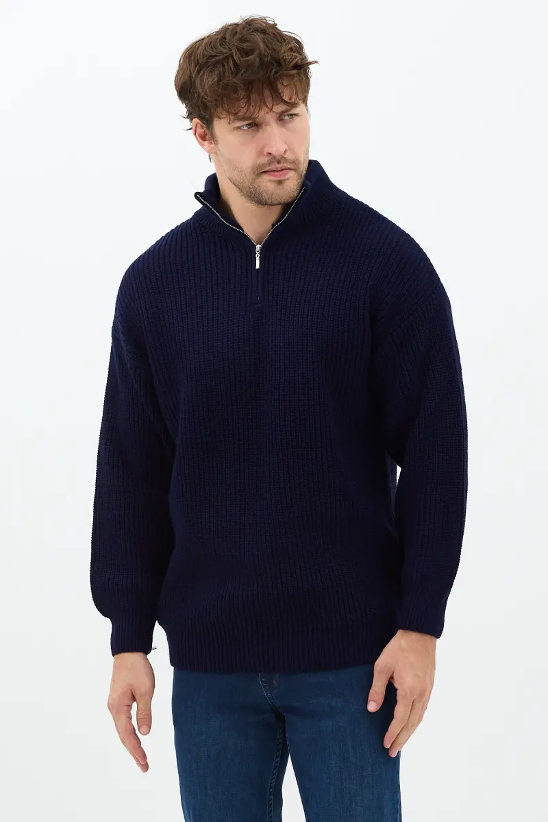 Lacivert Erkek Oversize Fermuarlı Balıkçı Triko Kazak-Mat Lacivert