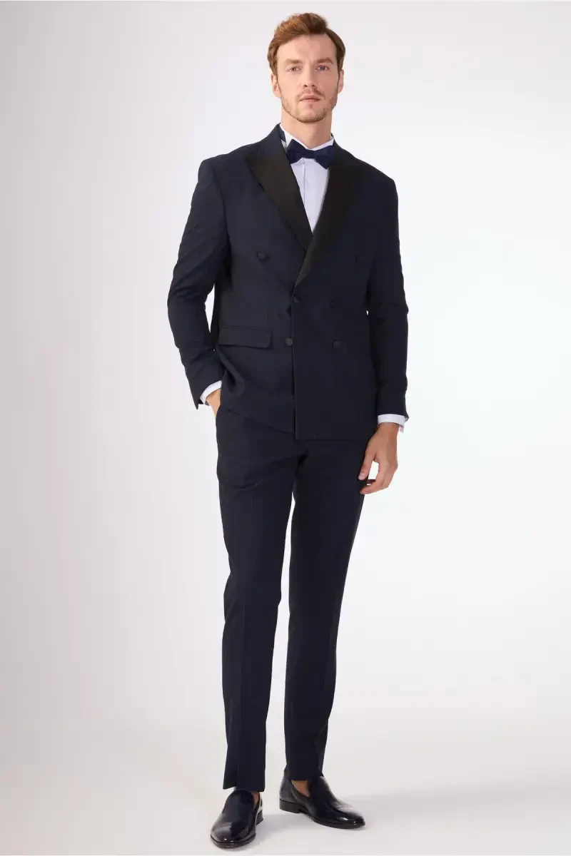 To'q ko'k erkaklar uchun ingichka o'lchamli tekis o'tkir yoqali smokin kostyumi to'y, niqoh, bitiruv marosimi, gala kechalari kabi maxsus kunlaringiz uchun ajoyib tanlov bo'ladi. Nozik turishi va zamonaviy dizayni bilan har qanday muhitda diqqatni o'zingizga jalb qilasiz.