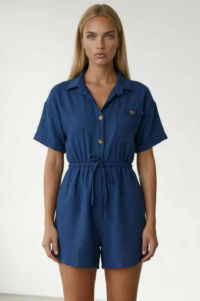 Lacivert Gömlek Yaka Çift Cepli Keten Şort Tulum-LACİVERT