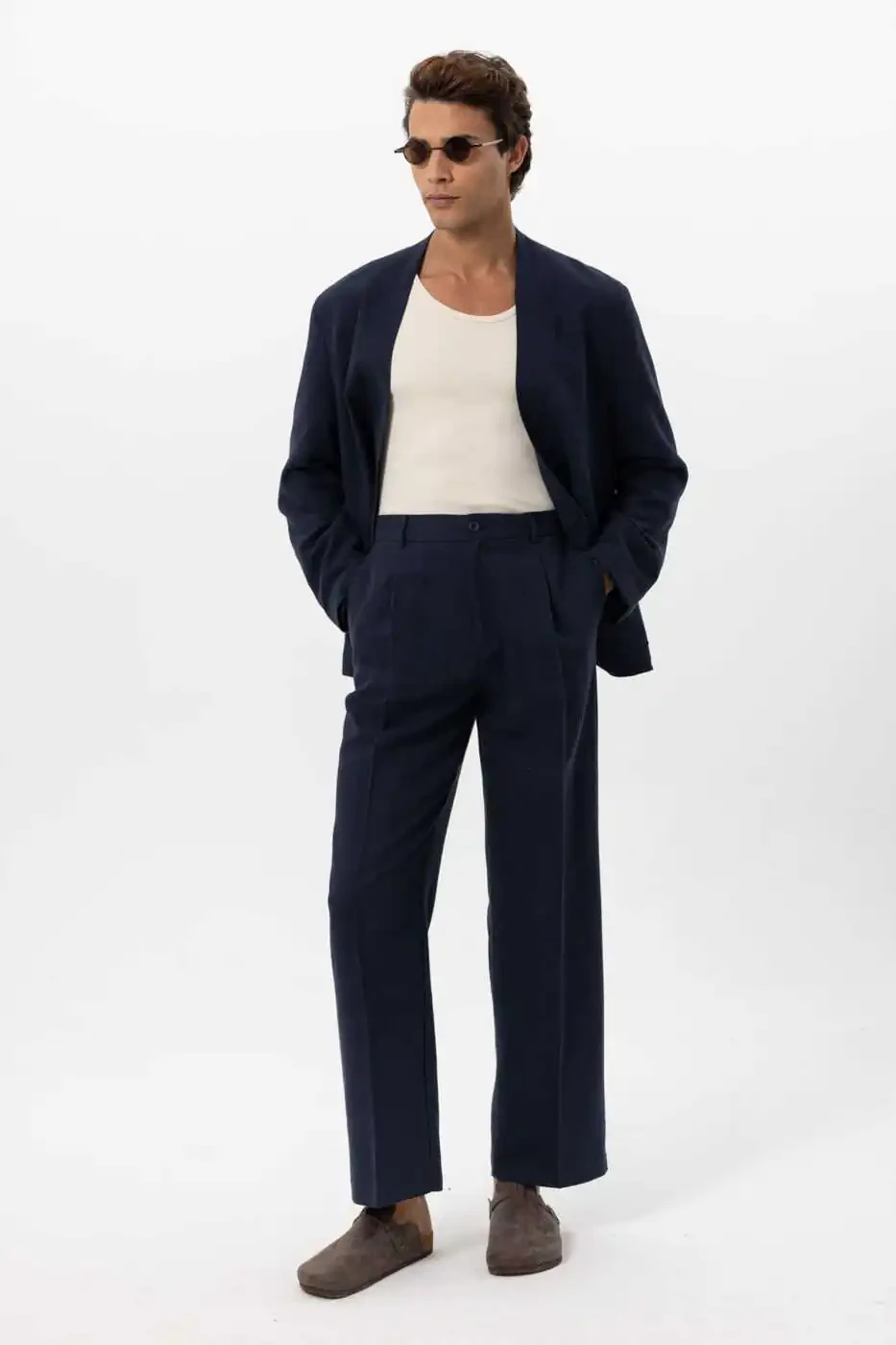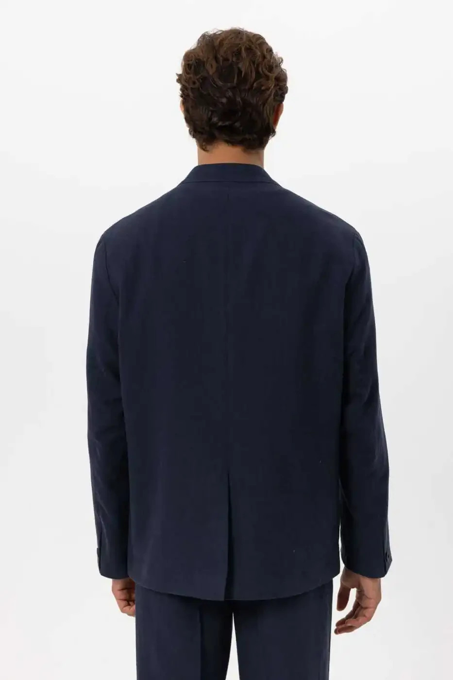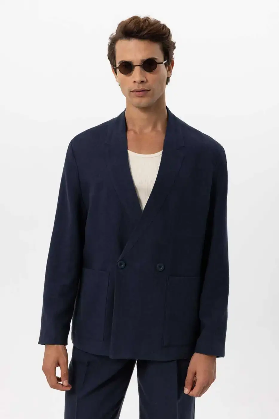 Our navy linen blend double-breasted buttoned men's blazer jacket is ready to become an indispensable part of your wardrobe, combining style and comfort.