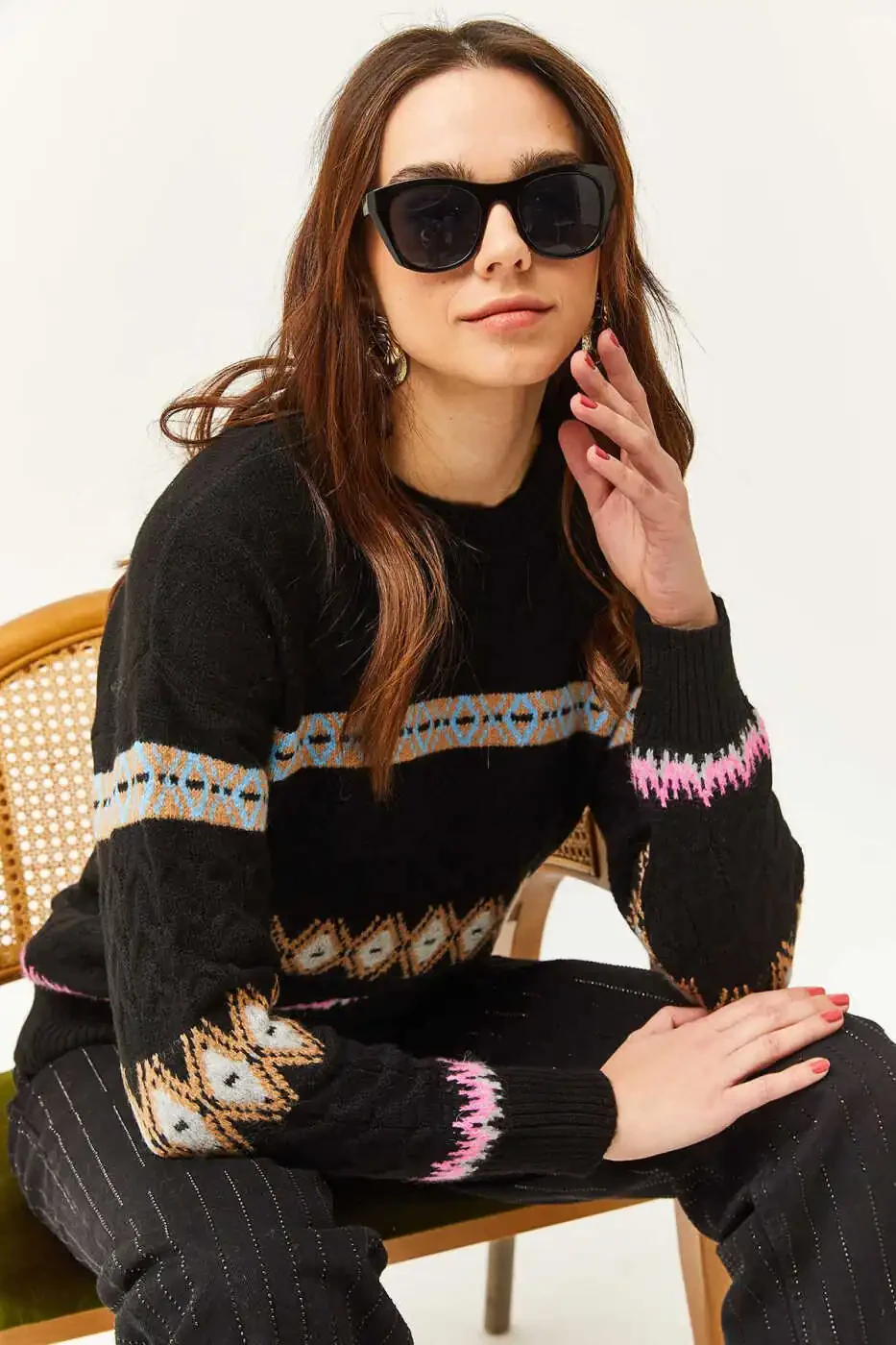 Women's Black Sweater, Baklava Striped Sweater, Soft Textured Sweater, TrendYol Sweater, Black Sweater Women