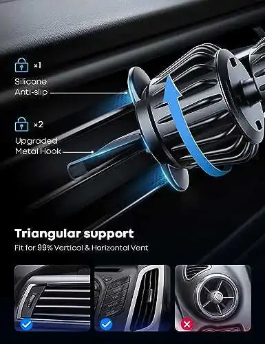 20 Upgraded Magnets: 2025 Upgraded Magnet Layout - 38.7% Power Boost! Lamicall car mount for Magsafe built-in 20 upgraded N52 super magnets, which can easily hold items up to 4.4 lbs. Super powerful magnets ensure a firm hold on your cell phones. Never afraid of falling off even braking strongly, taking sharp turns or driving on rough roads. A practical for MagSafe accessory, car accessory. Ultra-stable Connection: Significantly superior to plastic hook that easily snapped, the metal hook in this mag safe car mount is made of high-quality metal. Along with an upgraded locking mechanism, which ensures the ultra-stable connection between the for magsafe phone mount and the air vent. So as to ensure that your mobile phone can be stable even on bumpy roads, and 100% won't fall off. Wide Adaptability: The for magsafe car holder can place directly for iPhone 17, 17 pro, 17 pro max, iPhone 16, 16 pro, 16 pro max, iPhone 15, 15 Pro, 15 Pro Max, 15 Plus,14, 14 Pro, 14 Pro Max, 14 Plus, iPhone 13, 13 Pro, 13 Pro Max, 13 Mini, iPhone 12, 12 Pro, 12 Pro Max, 12 Mini & for MagSafe cases. NOTICE: The included metal ring (won’t interfere with wireless charging) is necessary if it work with other phone models or non-MagSafe cases. Easy to Place & Adjust: More convenient than clamp arm car phone mount holder, pick and place your phone in just one step on Lamicall magnetic phone holder for car. 360 Degree Adjustable & Rotatable Ball Joint allows you the best viewing angle easily. This car phone holder mount magnetic will free your hands, making calls and GPS navigation safer. Considerable Details: Compact and lightweight design of this magnet phone holder for car reduce the burden on the air vent and the blocking to the airflow. Superior materials make the for magsafe phone holder for car durable. The rubber pad prevents your telephone from being scratched. It’s one of the best for MagSafe accessories, car accessories.