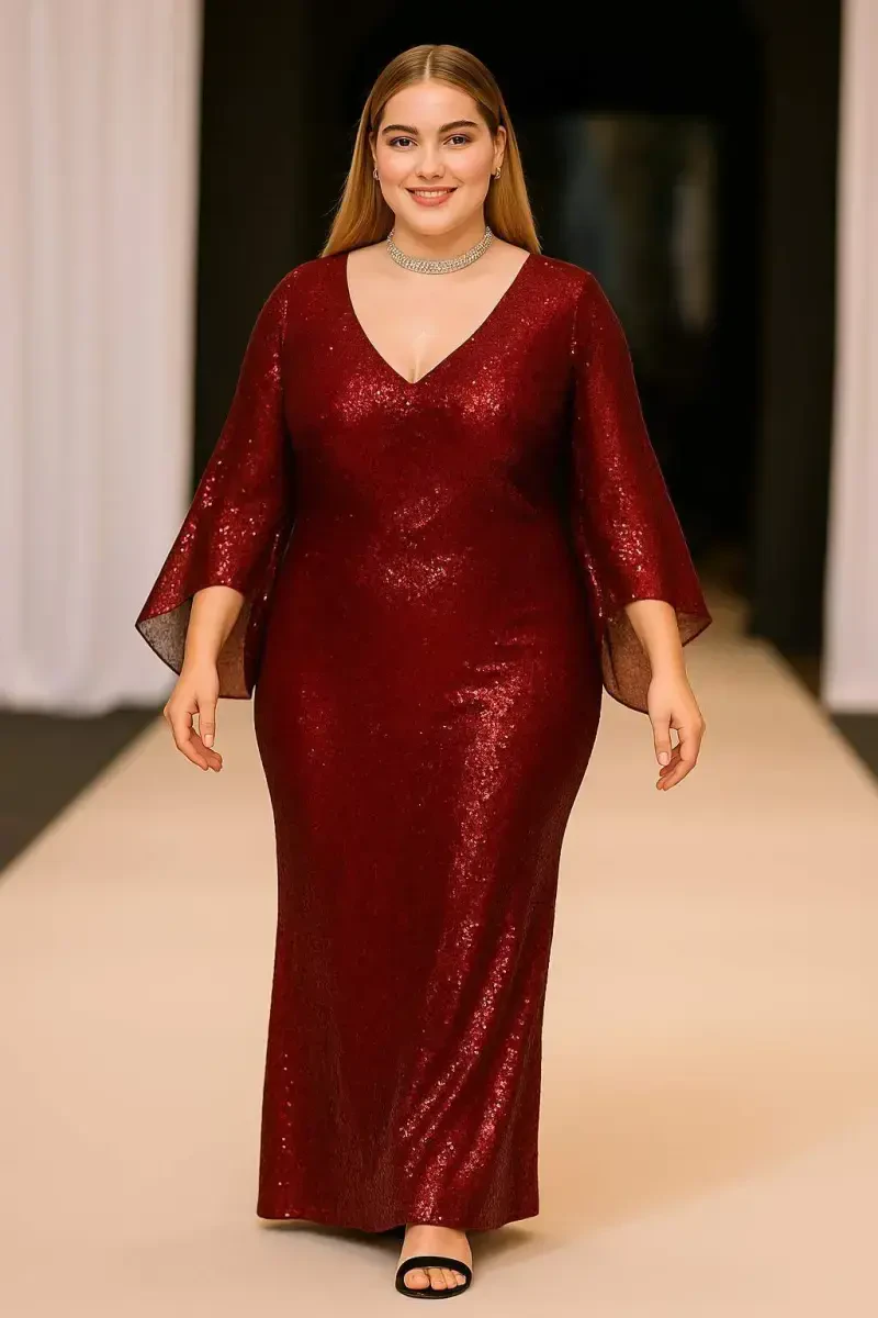 The Large Size Sequined Sparkling Long-Sleeved Evening Dress KL3100 Bordeaux, with its eye-catching design and elegant appearance, is a perfect choice for your special events. Designed according to the model's measurements, the dress has a special fit that will suit every size and body type. With its fabric structure that prioritizes comfort and mobility, it ensures a comfortable feeling all day long. Containing striking elegance in every detail, the dress helps you achieve a dazzling appearance throughout the night. The flawless harmony of sequins and beads creates a dazzling sparkle while providing an aesthetic look. The Bordeaux color adds a touch of elegance and sophistication, making it a choice that will make your special days unforgettable. You have found the evening dress of your dreams; it's time to experience this beauty, exclusive to you!