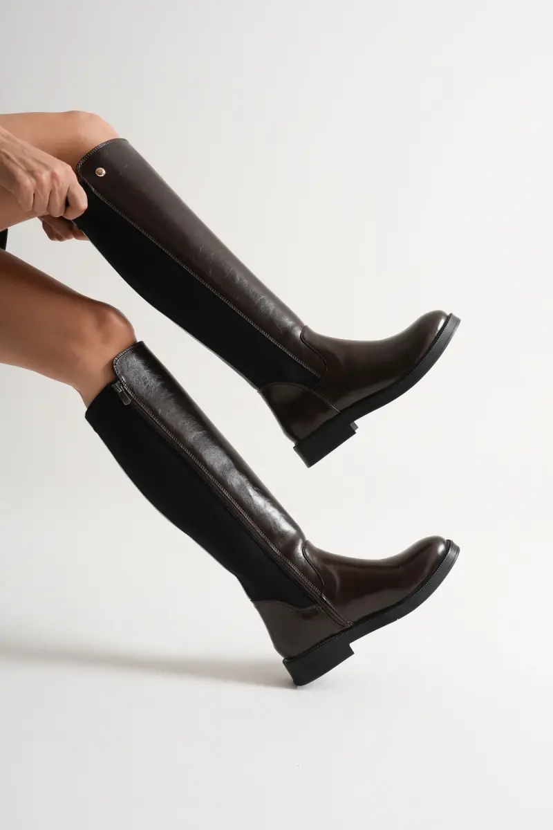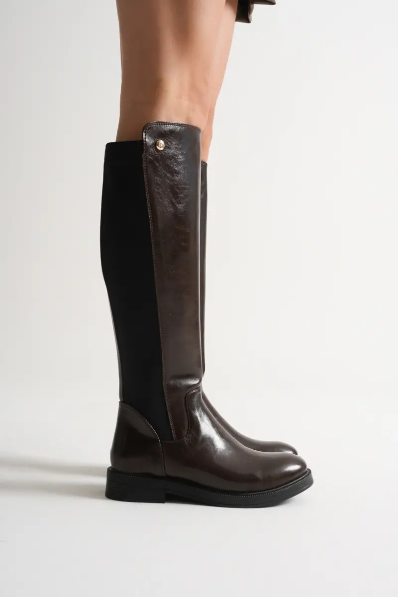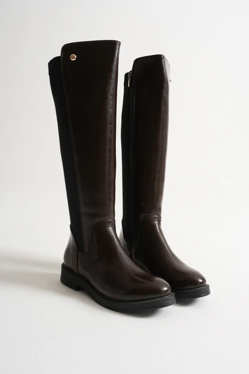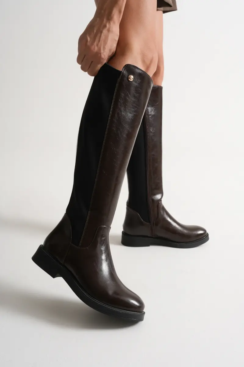 Lastikli Streç Günlük Kadın Çizme Kahve Parlak-Kahverengi