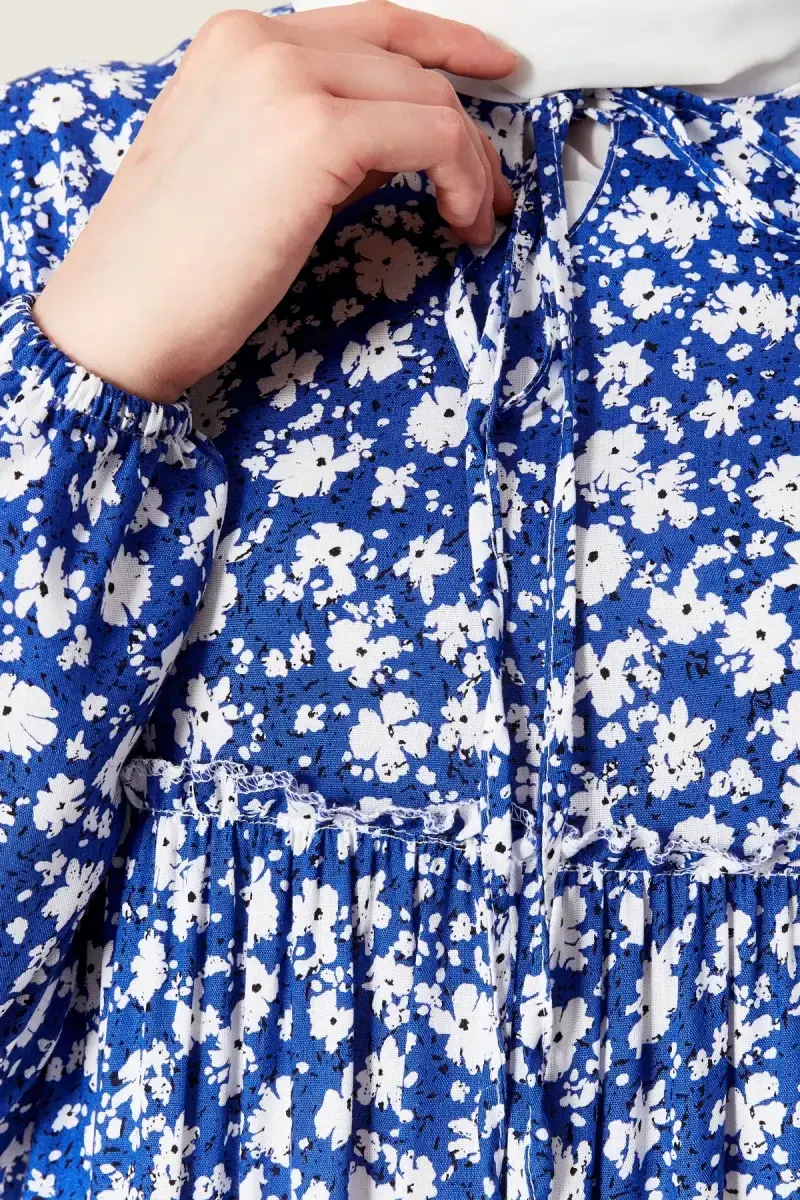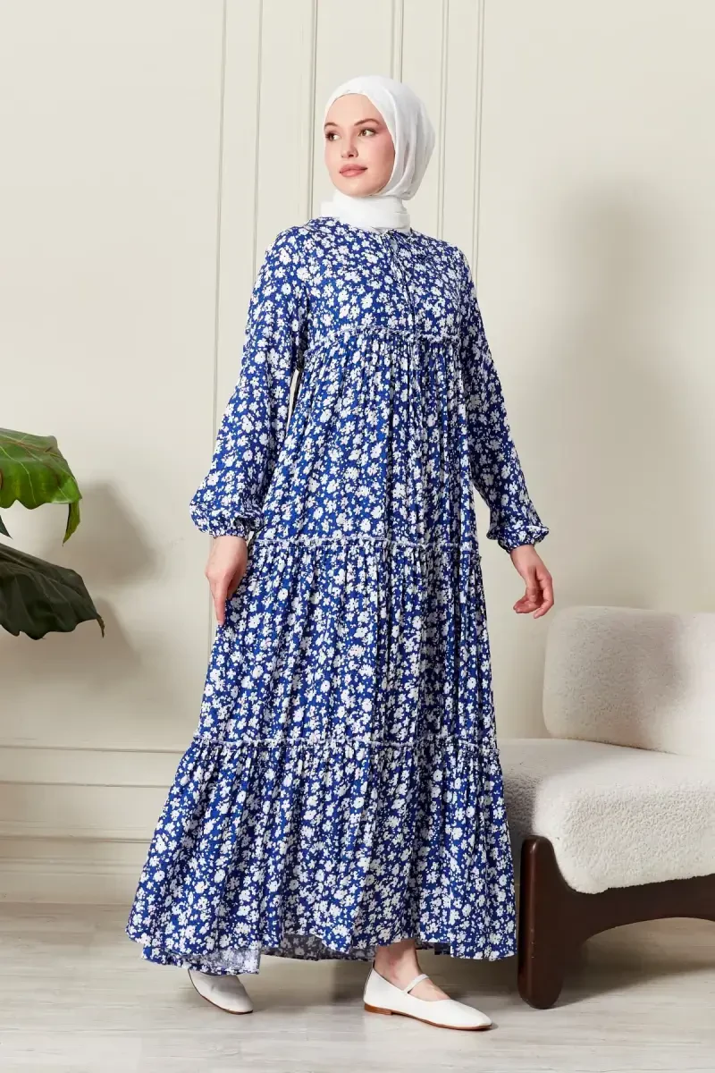 The Tiered Floral Print Gypsy Viscose Dress is a special design that combines elegance and comfort in modest fashion. This elegant dress is a versatile option that can also be preferred in the categories of mother dresses and prayer dresses. The tiered floral patterns on the skirt of the dress offer a lively and vibrant look, while the lightness of the viscose fabric provides comfort throughout the day. The crew neck adds a modern touch, while the drawstring belt detail gently emphasizes your waist, helping you create a feminine silhouette. This unique dress is an ideal piece to complete your elegance both in daily use and on special occasions. Designed in accordance with modest clothing principles, it offers safe and comfortable use with its non-transparent structure. The long-sleeved design keeps you warm in cool weather, while the long length cut emphasizes your elegance. The ruffled details of the dress add a lively and dynamic touch, while the viscose rib knit provides a soft touch to your skin. This dress, offered in a Flower Pattern Blue color option, is a candidate to be an indispensable part of your wardrobe. You can use this dress in your daily combinations or at special events, allowing you to express your elegance in any environment. Thanks to its easy care, it can be washed at 30 degrees and ironed to maintain its original form. Thanks to its natural cotton material, it is skin-friendly and provides all-day comfort with its breathable structure. Experience both a stylish and comfortable experience with the Tiered Floral Print Gypsy Viscose Dress.