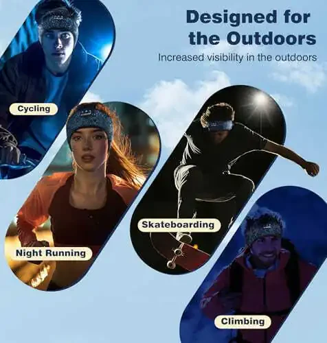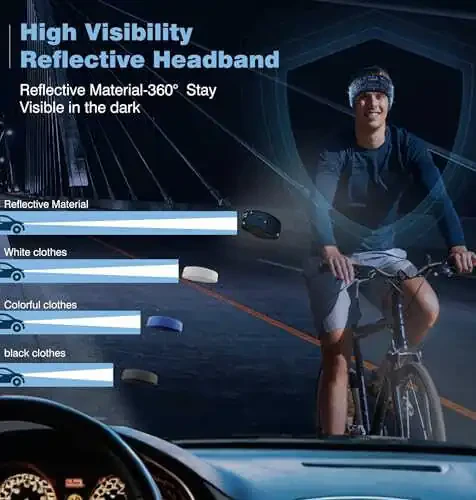 【High Visibility Reflective Headband】The 360 °reflective black headband headphones is made of high quality reflective material, which can effectively reflect the light from the street lamps or headlights, so that you can be seen more easily in the dark. 【Outoor Reflective Gear】This bluetooth headphones headband is designed for outdoor activities, lightweight and portable. The unique reflective material can improve visibility in low-light outdoor environments, especially suitable for running, cycling, hiking and other types of outdoor activities. 【Newest Bluetooth 5.4】Bluetooth 5.4 wireless headphones delay is reduced to 30 milliseconds, the coverage area is expanded to 15M, which can realize more efficient data transmission with lower power consumption. It can realize more stable and fast connection, and can reconnect within 1 ms under ideal conditions. 【Enjoy Music while Exercising】The Cooling Headband adopts a new blended technology to enhance the elasticity of the headband. Arc curve design, solidly fit your head, prevent the headband from slipping, can keep forehead dry and cool, so you can stay focused during exercise. 【High Elastic Nonslip Womens Mens Headband】 The Cooling Headband adopts a new blended technology to enhance the elasticity of the headband. Arc curve design, solidly fit your head, prevent the headband from slipping, can keep forehead dry and cool, so you can stay focused during exercise.