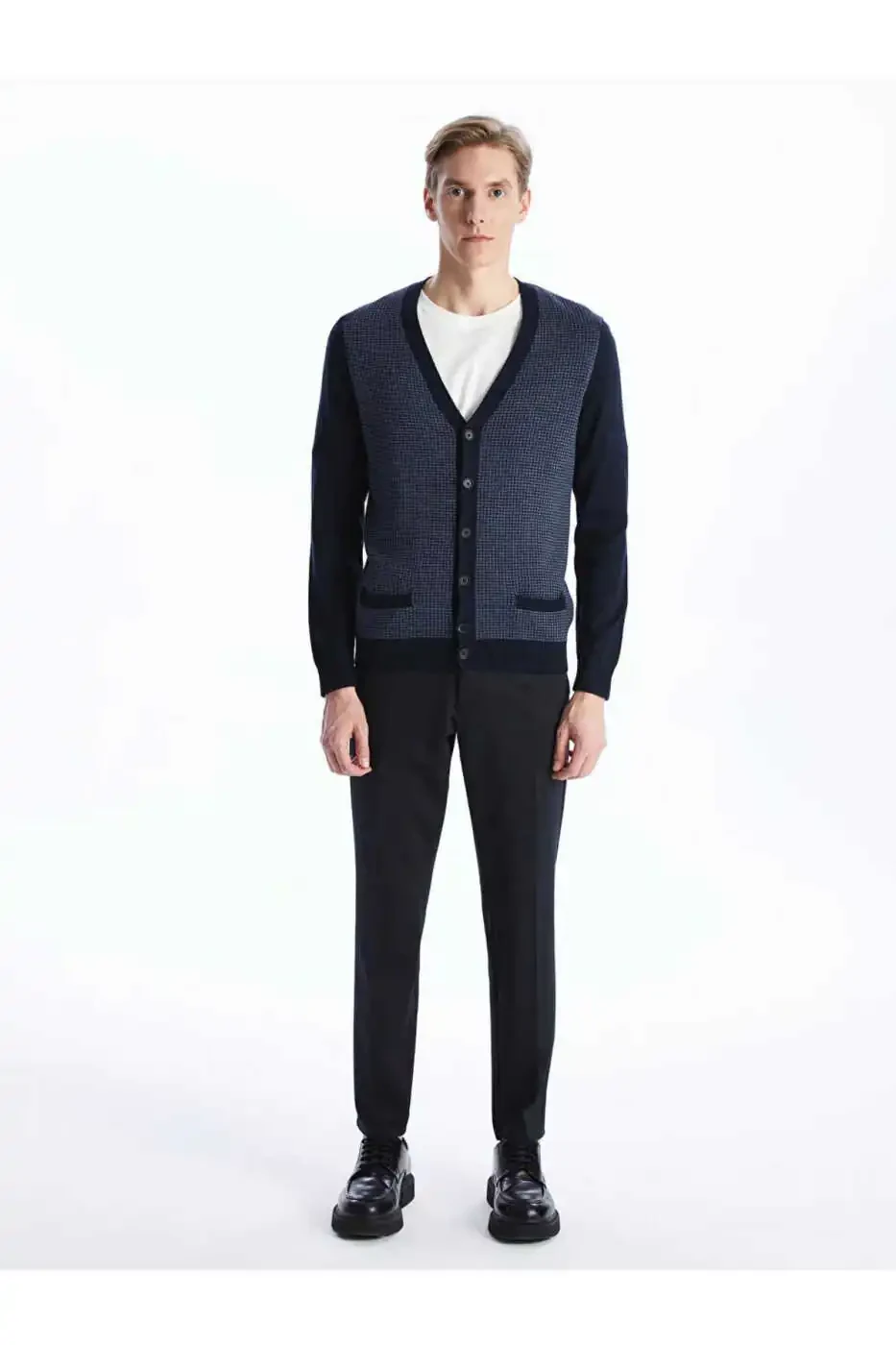 Experience style and comfort with the LCWAIKIKI Classic Navy Blue Standard Fit V-Neck Men's Knit Cardigan!