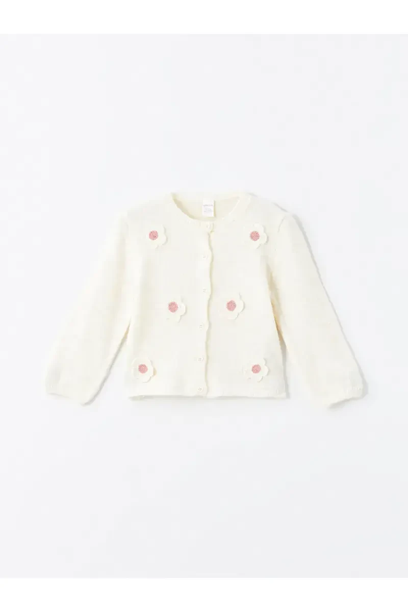 LCW Baby Ecru Crew Neck Floral Embroidered Baby Girl Knit Cardigan