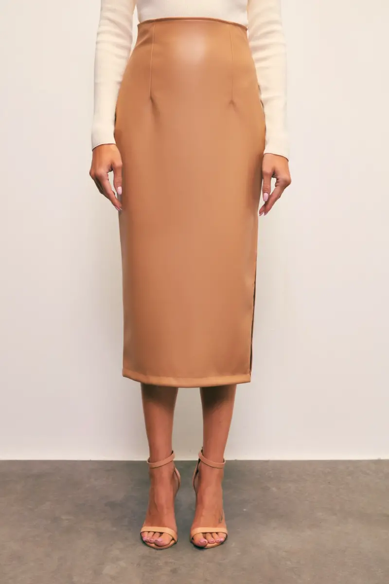 This leather skirt, which combines elegance and comfort, will become a staple in your wardrobe. Made from soft and high-quality leather, the skirt fits your body perfectly and provides an elegant look. The high-waisted cut emphasizes your waist, making you look taller and slimmer. The side slit detail adds movement to the skirt and boosts your confidence with every step.