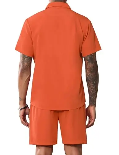 LecGee Men Summer Casual Short Sets Solid Short Sleeve Pocket Button Down Shirt Elastic Shorts 2 Piece Outfits Tracksuit