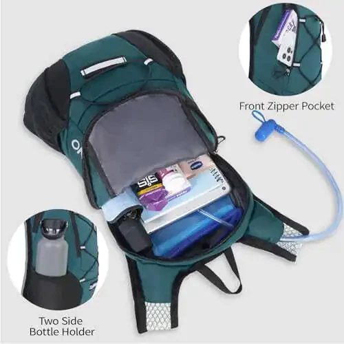 Резервуар для воды изготовлен из прочного, не содержащего BPA материала, обеспечивая безопасный и гигиеничный опыт питья. Внешние карманы рюкзака идеально подходят для переноски небольших предметов, таких как телефон, ключи и кошелек. Он также оснащен петлей для крепления сигнального фонаря и водонепроницаемой накидкой.