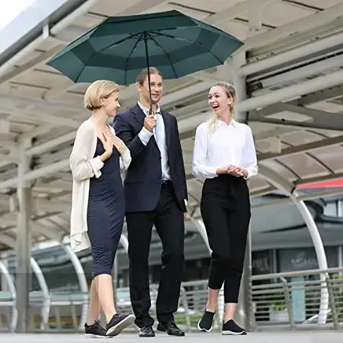 Lejorain Large Folding Golf Umbrella, hem geniş bir koruma alanı sunan hem de taşınabilirlikten ödün vermeyen üstün bir tasarıma sahiptir. Bu kompakt erkek şemsiyesi, seyahatlerinizde, golf sahasında veya günlük kullanımda size eşlik etmek için idealdir. Rüzgara ve yağmura karşı dayanıklı yapısıyla öne çıkan bu şemsiye, 54 inçlik genişliğiyle en az iki kişiyi rahatlıkla koruyabilir. Katlandığında yalnızca 15.25 inç boyutuna ulaşması ve sadece 1.3 lb ağırlığında olması, benzer büyüklükteki golf şemsiyelerine kıyasla belirgin bir avantaj sağlar. İster köpeğinizi gezdirirken, ister favori sporunuzu izlerken, isterseniz de çocuklarınızı okuldan alırken bu şemsiyeyi yanınızdan ayırmak istemeyeceksiniz. Ani yağmurlarda hızlıca açılıp kapanabilen otomatik mekanizması sayesinde, arabanıza, binanıza veya çadırınıza saniyeler içinde güvenle girebilirsiniz. Lejorain Large Folding Golf Umbrella, suya dayanıklı 210T kumaşı ve özel Dupont Teflon kaplaması ile hızlıca kurur. Ergonomik gerçek ahşap sapı, parmak oluklarıyla tasarlanmıştır ve tutuş kolaylığı sağlarken, lüks bir his sunar. Bu şemsiye, rüzgar geçirmez özelliği, dayanıklı yapısı ve şık tasarımıyla golf, seyahat ve iş hayatınızda vazgeçilmez bir aksesuar olacaktır. Kullanışlı kılıfının kaliteli fermuarı sayesinde şemsiyenizi kolayca çıkarabilir ve tekrar saklayabilirsiniz. Lejorain ile yağmurlu günler artık bir sorun olmaktan çıkıyor; şıklığınızdan ve konforunuzdan ödün vermeden hava koşullarına meydan okuyun.