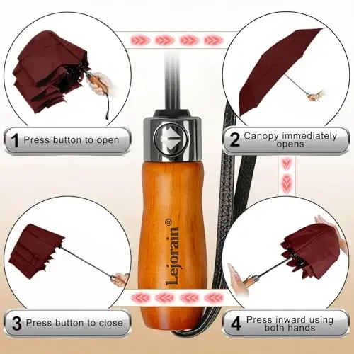 Lejorain Large Folding Golf Umbrella turli xil rang variantlarida mavjud. Tajribali golf soyabon ishlab chiqaruvchilari tomonidan yuqori sifatli materiallardan tayyorlangan. Erkaklar va ayollar uchun ham mos keladi. Sayohatlarda, golf maydonida yoki kundalik foydalanishda ideal. Suv o'tkazmaydigan va tez quriydigan matosi tufayli har doim foydalanishga tayyor. Shamolga chidamli dizayni to'satdan shamol esganida teskari burilishning oldini oladi.
