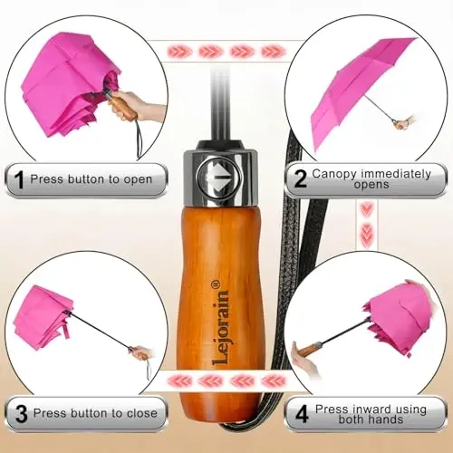 Lejorain Large Folding Golf Umbrella is a compact, travel-friendly, rain and windproof umbrella designed for both men and women. Standing out with its 54-inch width, this foldable automatic open and close umbrella provides superior protection with its 210T Teflon-coated ventilated double-layered construction. While spacious, this umbrella doesn't compromise on portability, folding down to just 15.25 inches and weighing less (only 1.3 lb) than other umbrellas of similar size. Distinguished by its windproof and durable construction, its ventilated double-layered design allows wind to pass through, preventing it from inverting. The fiberglass and stainless steel frame system offers superior resistance to rust and breakage. The automatic opening and closing feature allows it to open and close quickly in sudden rain, providing quick entry into a vehicle, building, or tent. Its waterproof fabric and luxurious wooden handle further enrich the user experience. Thanks to the 210T fabric and Dupont Teflon coating, it is waterproof and quick-drying. Its ergonomic wooden handle with finger grooves makes it easy to hold and provides comfortable use. Lejorain is known for its high-quality golf umbrellas offered by experienced golf umbrella manufacturers, catering to all tastes with different color options. Whether on the golf course, in the city, or while traveling, the Lejorain Large Folding Golf Umbrella is an ideal option to accompany you in all weather conditions. This umbrella not only protects you from the rain but also from the harmful effects of the sun. Its durable construction offers long-lasting use, while its stylish design complements your style. Thanks to its compact size, it can be easily carried in your bag or backpack and is always ready for use. Don't compromise on your style and comfort even on rainy days with the Lejorain Large Folding Golf Umbrella. This umbrella is not just an accessory but also a helper that makes your life easier. It can be a great gift option for yourself and your loved ones. Made of high-quality materials and meticulously designed, this umbrella will accompany you for many years and will always make you feel safe.