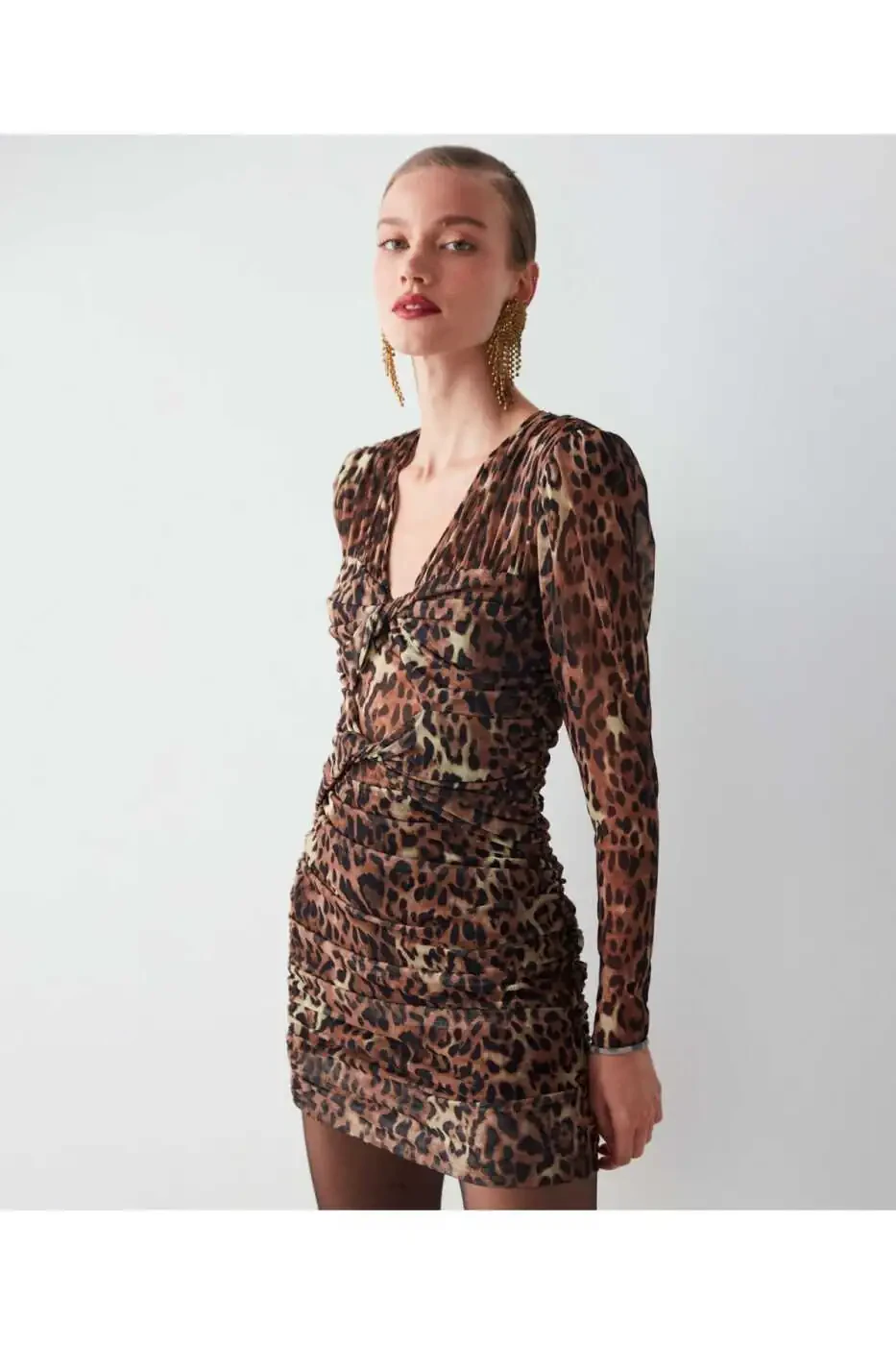 leopard print dress, draped dress, elegant dress, women's clothing, fashion, trendy dress, leopard pattern, evening dress, party dress, special occasion dress