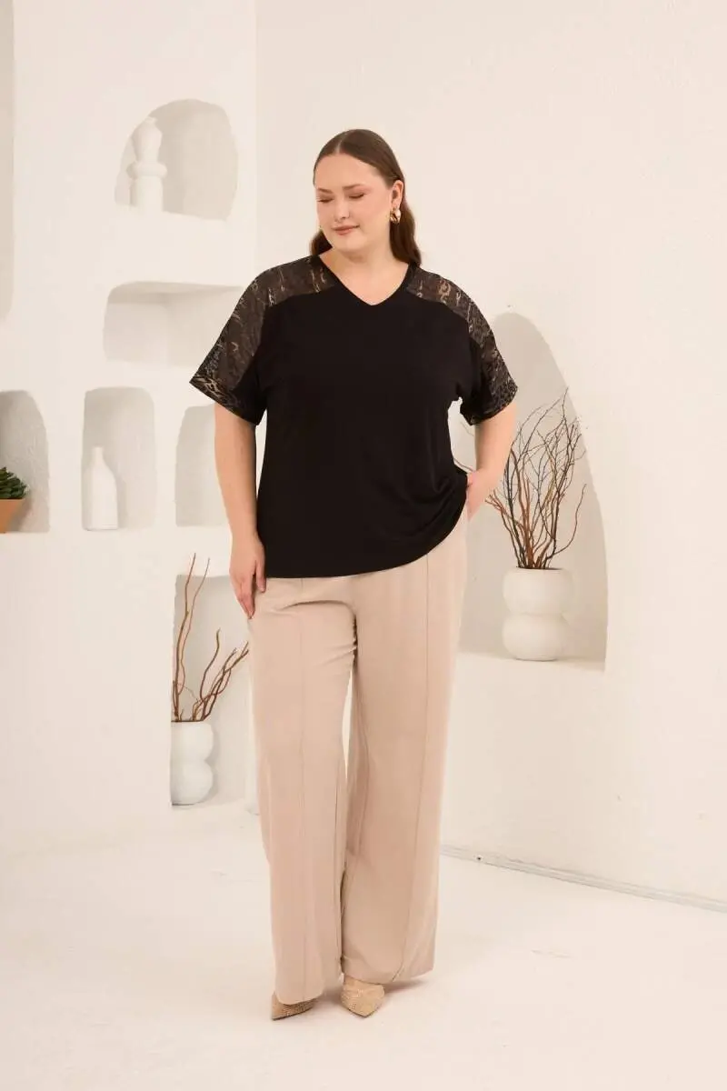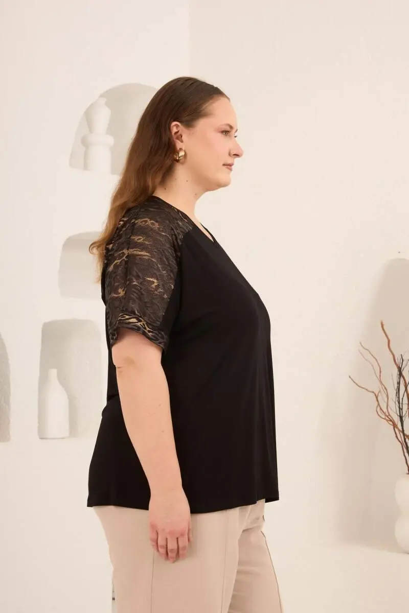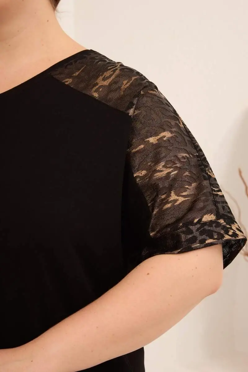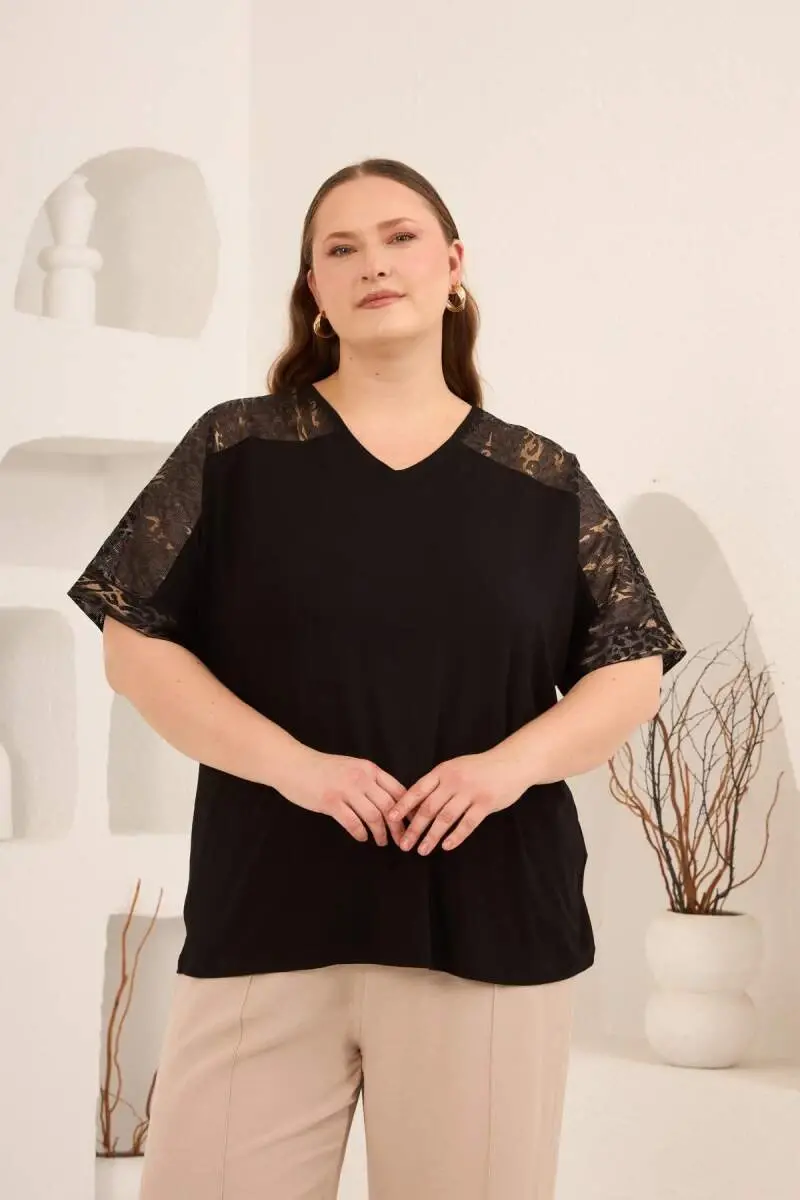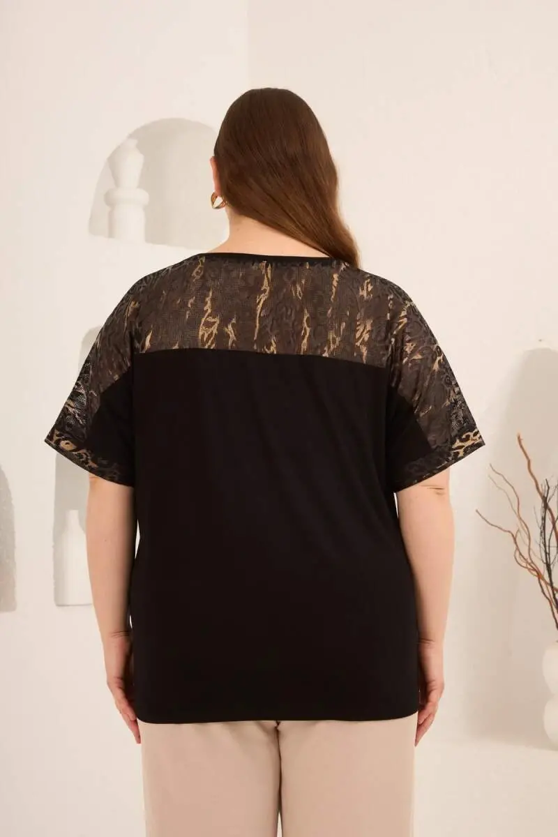 Leopar File Garnili Kadın Büyük Beden Tişört Siyah