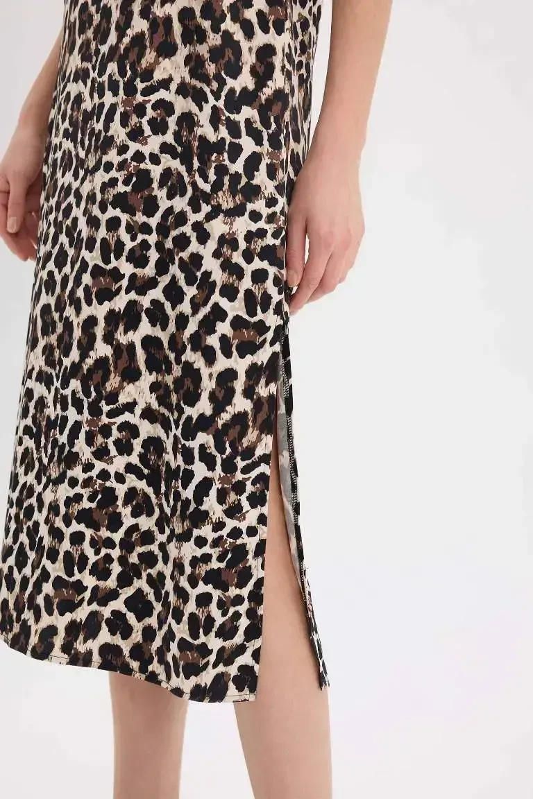 Leopard Print Round Neck Satin Sleeveless Midi Dress - Black, poised to become an indispensable part of your wardrobe! This special design, offering elegance and comfort in one, will ensure you dazzle in any setting. Combining the nobility of black with leopard print, this dress is an ideal choice for women who want to create a modern and trendy look. The midi length of the dress offers a length suitable for both daily use and special occasions. The round neck design exudes an elegant stance, while the sleeveless model does not restrict your freedom of movement. The luxurious texture of the satin fabric creates a statement of elegance on you. The shiny and fluid structure of satin adds a sophisticated touch to the dress, while the leopard print offers a bold and eye-catching style. The normal waist detail naturally accentuates your body lines, making you look fitter and more elegant. The cut of the dress is designed to suit every body type. You can create different styles by combining it with a stylish jacket or cardigan, or wear it alone. When combined with high heels, you'll be ready for a special invitation, while you can complete your daily elegance with sandals or flats. This dress provides a soft touch to your skin thanks to its 100% viscose content. The breathable structure of viscose fabric guarantees you comfort all day long. The black color easily matches with all kinds of accessories and shoes, offering freedom of combination. The leopard print creates a modern look with a classic touch. Produced with the quality of the Defacto brand, this dress is long-lasting and durable. Thanks to its trendy design, it ensures you stay up-to-date and stylish at all times. Especially ideal for the winter season, this dress is a perfect choice for women who love casual elegance. The fact that the product is manufactured in Turkey is also important in terms of supporting domestic production. If you are not sure about your size, you have the opportunity to find the right size by trying the product at home. If the size does not fit, you can exchange it for free at the store, excluding socks, underwear and jewelry. In this way, you can safely enjoy online shopping. Reflect your style and let your elegance speak with the Leopard Print Round Neck Satin Sleeveless Midi Dress - Black! This special design is poised to become the most loved piece of your wardrobe.