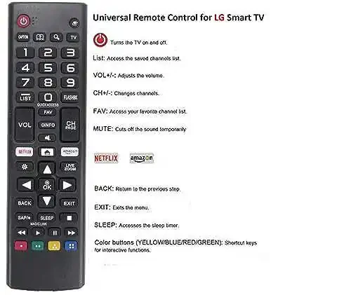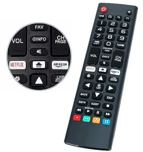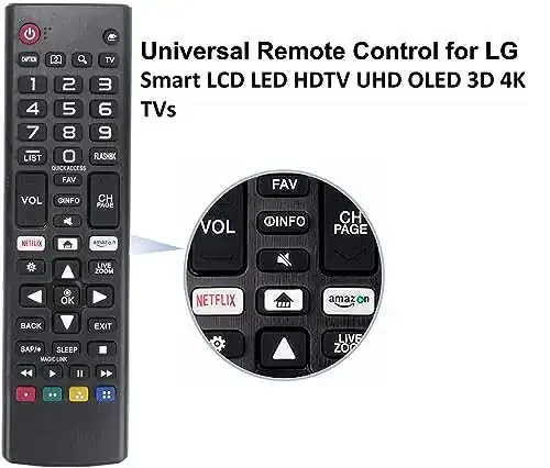 Universal Remote Control Replacement for LG Smart TVs All Models: AKB75095307 AKB74915305 AKB75375604 AKB74475401 AKB74475433 AKB73975702 AKB75055701 AKB73975711 AKB73715608 AKB74475401 AKB75375604 AGF76631064 AKB74915324 AKB73715601 AKB75095308 Suitable for All LG LCD LED HDTV 3D Smart TVs Brand new and high grade. No programing or pairing needed, put new AAA batteries and it can work well Replaces your damage or old one and covers all the functions of the original remote. Package Content: 1 x IR Remote Control (batteries and instructions are not included)
