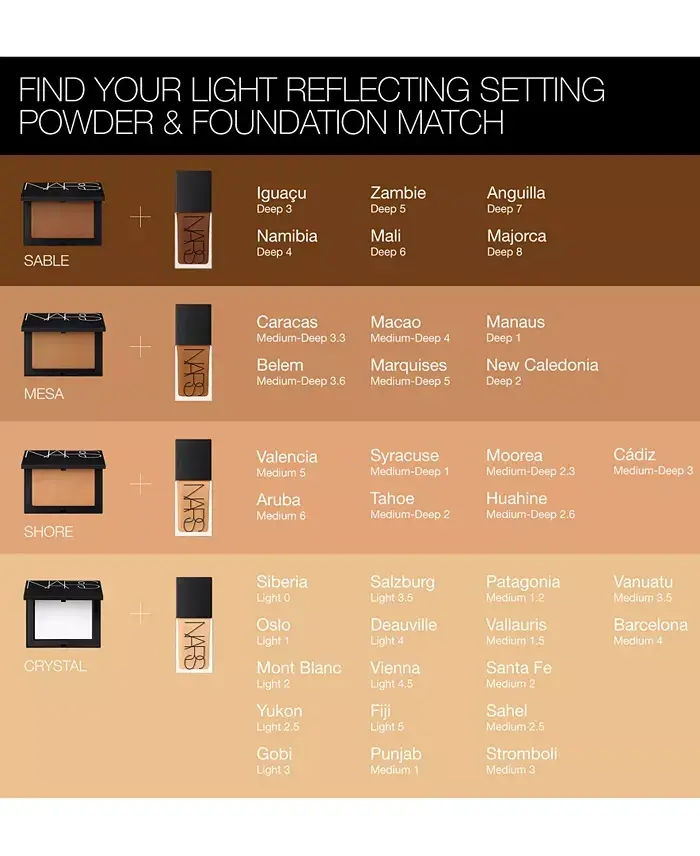 Undetectable. Unrivaled. Universally-flattering. Cult-favorite Light Reflecting Setting Powder is now available in four shades for all skin tones. Lightweight and easy to blend, the iconic formula locks makeup in place all day with a weightless, luminous finish. Powered by NARS' Light Reflecting Complex, it optimizes light reflection on the skin, creating a soft-focus effect by optically fading fine lines, wrinkles, and pores. No-flashback formula features Photochromic Technology, which diffuses and adjusts to new sources of light, so skin looks perfect in person, and on camera. Microfine mineral powders loaded with Glycerin and antioxidant-rich Vitamin E help guard against dryness and keep skin comfortable all day. Four translucent shades. One bestselling formula. Reveal your appeal. WHAT IT DOES: INVISIBLE, WEIGHTLESS FINISH Weightless formula applies evenly and blends effortlessly, enhancing the look and wear of foundation. EXTENDED SHADE RANGE Iconic, bestselling setting powder is now available in a range of four translucent shades for all skin tones. PHOTO-FRIENDLY FORMULA THAT'S PERFECT IN ANY LIGHT No-flashback formula features Photochromic Technology that diffuses and adjusts to new sources of light so skin looks perfected in person, and on camera. NARS' exclusive Light Reflecting Complex™ optimizes light reflection for a soft-focus effect. Fine lines, wrinkles and pores optically fade as skin is visibly smoothed. IMPROVES THE LOOK OF SKIN Microfine mineral powders loaded with Glycerin and antioxidant Vitamin E help guard against dryness and keep skin comfortable all day. Plus, NARS' exclusive Light Reflecting Complex™ helps restore skin's youthful radiance. HOW TO USE: When using for the first time, swirl #13 Powder Brush (sold separately) multiple times on the surface to soften the powder. Tap off excess and gently sweep onto the face to set makeup with a luminous, photo-ready finish. Press and roll onto skin with a powder puff or #15 Precision Powder Brush (sold separately) to lock complexion products in place. This also works well for targeted application to smaller areas of the face, like the undereye area or around the nose. KEY INGREDIENTS: Light Reflecting Complex™: optimizes light reflection on the skin, creating a soft-focus effect by optically fading fine lines, wrinkles, and pores. Photochromic Technology: diffuses and adjusts to new sources of light, so skin looks perfect in person, and on camera. Microfine Mineral Powders: loaded with Glycerin and antioxidant-rich Vitamin E help guard against dryness and keep skin comfortable all day. USE WITH: NARS Light Reflecting Foundation NARS Radiant Creamy Concealer #13 Powder Brush #15 Precision Powder Brush