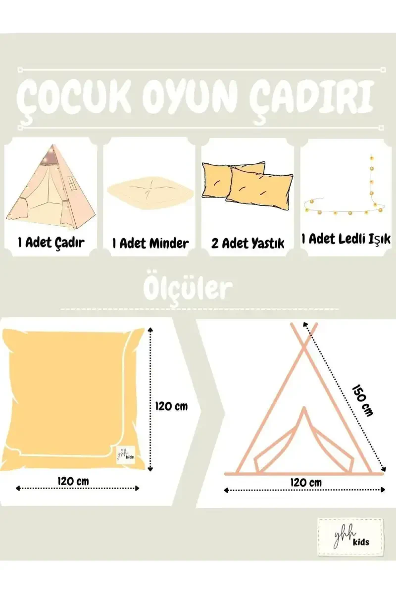 Meet the Lighted Children's Play Tent Teepee Play House, which will color your children's imagination and offer them a special playground! This unique play tent is designed to create a safe and extremely fun environment for little adventurers. While adding a warm and natural touch to their rooms with its beige color, it transforms night game hours into a magical atmosphere with its illuminated design. This play tent, offered with YHH Kids quality, allows children to develop their creativity, unleash their imagination and socialize. Its teepee-style design introduces them to different cultures, while its padded cushion offers a comfortable gaming experience. Children can come together with their friends in this special area, create unforgettable memories, create their own worlds and make their dreams come true. Our product is suitable for all children aged 1 year and older. It is made of safe materials and does not contain any substances that could harm children's health. It is extremely easy to install, so parents can have a pleasant time with their children. The play tent can be easily used in children's rooms, as well as in the garden, on the balcony or on the terrace. Its illuminated design allows children to spend more time inside the tent. LED lights add a warm ambiance to the environment, making children's games even more enjoyable. Padded cushions ensure that children are comfortable during long-term games. In this way, children have fun and relax. This play tent is not just a playground, but also contributes to children's personal development. Children develop their problem-solving skills, communication skills and social skills by playing games on their own or with their friends in the tent. In addition, they take on different roles by using their imagination, create stories and develop their ability to express themselves. The Lighted Children's Play Tent Teepee Play House can be an unforgettable gift option for your children. Be ready to see the happiness on your children's faces with this unique product, which will offer them a special world while contributing to their development. This tent will be their favorite playground and will allow them to create unforgettable memories for years. The beige color adapts to all kinds of room decorations, while its stylish design adds an aesthetic touch to their rooms. Expand your children's imagination with this product, offer them endless play opportunities and support their development.