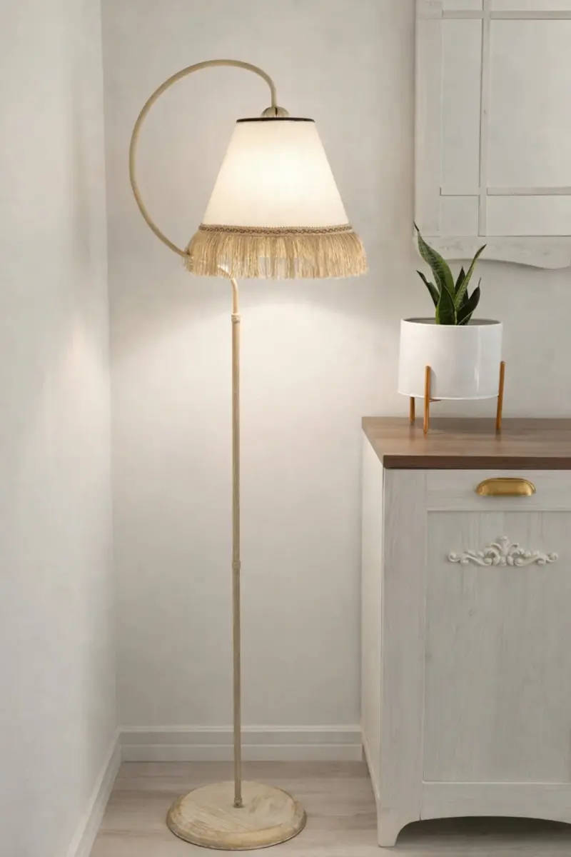 floor lamp, lighting, cream, yellow, patina, shade, tassel, living room, bedroom, reading corner, decoration, elegant, sophistication