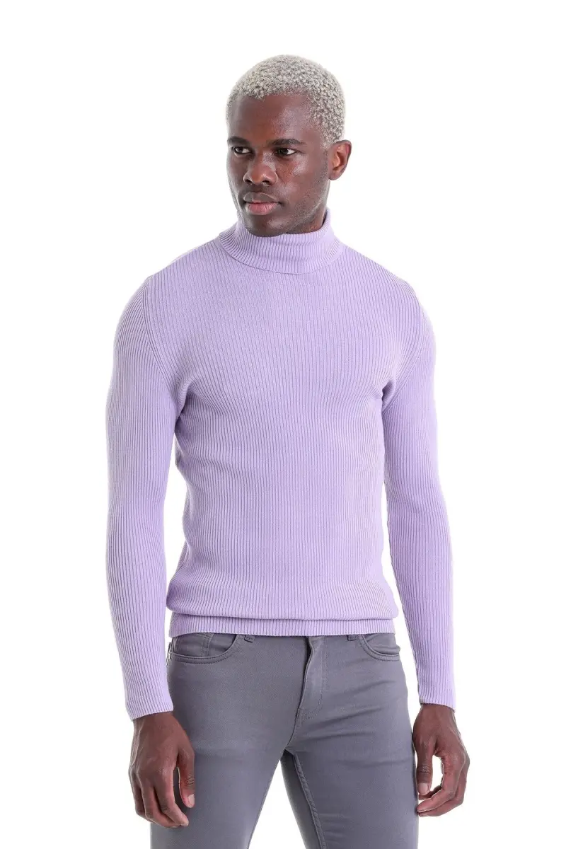 Lila Comfort Fit Fitilli Balıkçı Yaka Yünlü Yün Kazak-Lila