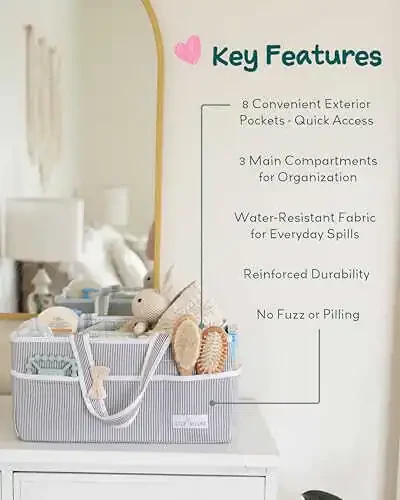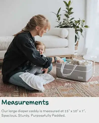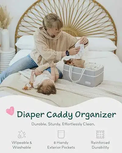 polyester Stylish & Functional Diaper Caddy Organizer for Boy or Girl Nursery Room - Our diaper tote is designed with adorable style and colors, and is built with quality fabric. It is soft to touch and high standard you would expect, including removable organizing dividers that you can organize diapering essentials such as diapers, wipes, lotions, toys and many more, all in one place. Perfect Size & Adorable Storage Caddy - Our caddy organizer is sized at 15" x 10" x 7”. It is large enough to store any baby diaper sizes, or mothers breastfeeding nursing need. This versatile big caddie is lightweight and durable. The gray gender-neutral color is perfect for moms and dads to carry any infant items for boys and girls. The linings are treated with water-resistance feature and it can be hand washed for easy clean. Multi-Purpose Diaper Basket with Removable Dividers - This portable diaper caddie adds great style for your changing table station or anywhere in your nursery or family room. It is portable enough to be carried anywhere in the house or onto the car travel trips. The removable inserts can be easily removed and use it as a large bin to store blankets, baby clothes, etc. This bag is collapsible and foldable for easy packing and travel. Perfect Baby Shower Gifts Ideas & Favorites - Newborns registry must haves! This unisex neutral diaper caddy makes a great gift basket at baby shower or newborn gift registry. This practical and versatile organizer can be used by moms from crib side changing table to living room, or car backseat. Diaper Organizer for Changing Table - Our caddy organizer is your solution to organize baby essentials. It's a diaper caddy basket and changing table organizer in one, keeping everything you need within arm's reach for hassle-free diaper changes. Spacious baby caddy organizer – Our diaper caddy features three large main compartments, each measuring 10" x 5.5", perfect for organizing diapers, wipes, and baby essentials. It also includes eight exterior pockets, each 5" wide on the longer sides and 10" wide on the shorter sides, providing easy access to smaller items like pacifiers, lotions, and toys.