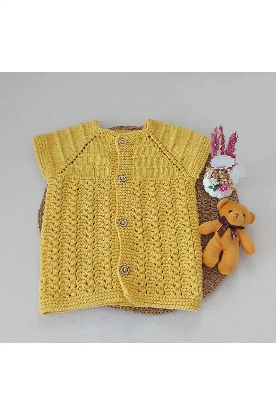 Вязаный вручную из мягкой хлопчатобумажной пряжи лимонно-желтый жилет для новорожденных, который сделает первые дни вашего малыша незабываемыми. Изготовлен из натурального хлопка, имеет дышащую и комфортную структуру, которая не повреждает нежную кожу вашего малыша. Застежка на пуговицах позволяет легко одевать и раздевать ребенка. Милые пуговицы на жилете добавляют стильности вашему малышу.