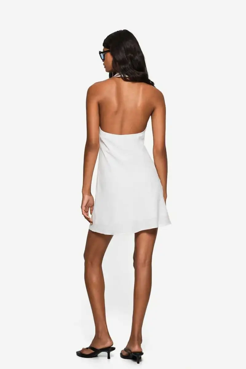 Produced with Bershka quality, this dress offers both elegance and comfort. Thanks to its high-quality fabric structure, it maintains its durability for a long time, while its carefully designed cut perfectly emphasizes your body lines. Its mini length makes your legs look longer and thinner by highlighting them. The halter neck detail elegantly reveals your shoulders and back. The white color of the dress can be easily combined with all kinds of accessories and shoes, so you can look stylish and stylish in every setting. It is a perfect choice for all kinds of activities, from summer parties to daily outings.