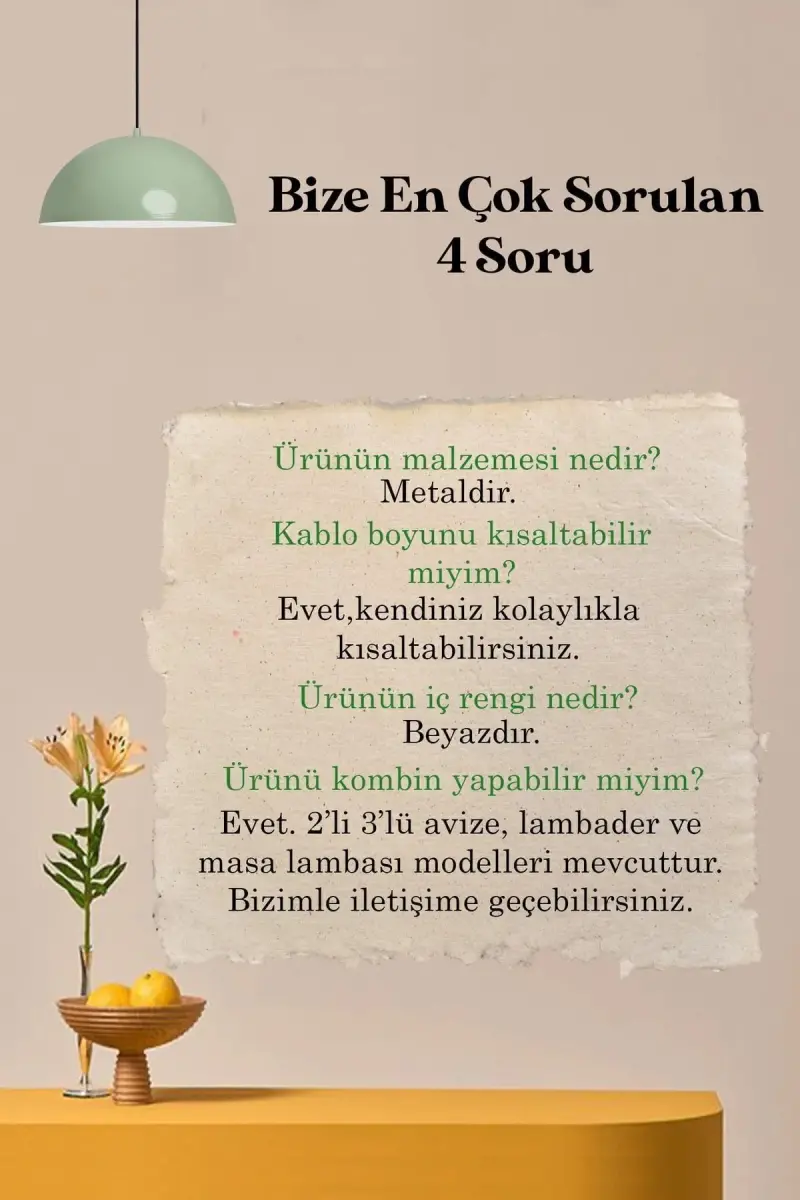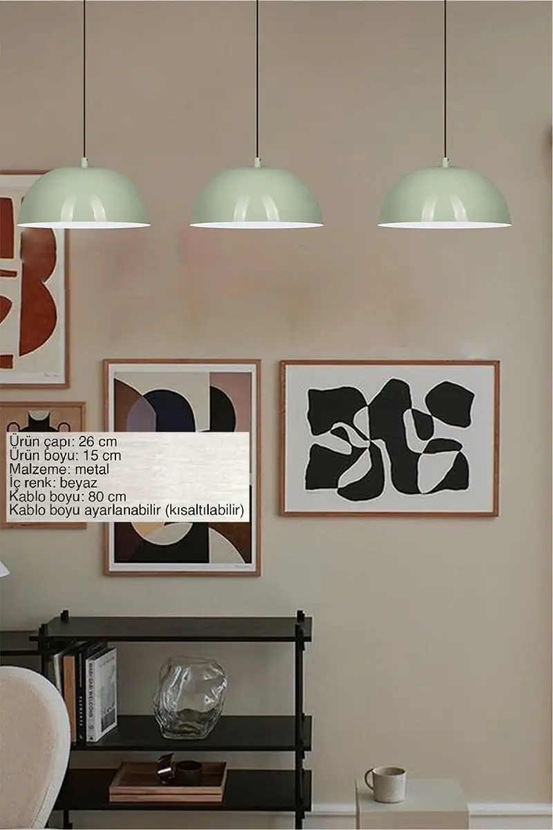 Add a refreshing touch to your living spaces with the Lipeo Mint Green Chandelier Single Pendant. This decorative lighting, which will suit any space from your living room to your kitchen, from your hairdresser to your cafe, dazzles with its modern and stylish design. The mint green color adds vitality and peace to the environment, while the single pendant model creates a focal point. Moreover, this chandelier, offered with Bamyum assurance, has high quality standards and promises long-lasting use. The importance of lighting in home decoration is great, and the Lipeo Mint Green Chandelier is not only a light source, but also a decorative object that changes the atmosphere of the space. It can easily adapt to any decoration, whether furnished in a modern or classic style. Ideal especially for nursery and children's rooms, this chandelier creates a fun and cute atmosphere that enriches children's imagination. The 80 cm pendant cable length of the chandelier can be adjusted according to the desired height, so it can be easily used in spaces with different ceiling heights. Installation is extremely easy and hanging brackets are included with the product. The metal body gives the chandelier strength and durability, while the mint green paint preserves its vitality for many years. Lipeo Mint Green Chandelier is a lighting solution that is preferred not only in homes but also in commercial spaces. In businesses such as restaurants, cafes, patisseries, hairdressers, barbers, shops and boutiques, it helps you offer your customers a warm and inviting environment. In offices, meeting rooms and executive rooms, it makes the working environment brighter and more motivating. This chandelier is compatible with energy-saving, halogen and LED bulbs, and has an E-27 socket type. By using bulbs with a maximum power of 60Watt, you can both save energy and obtain sufficient lighting. All parts of the product are available in our stocks and can be obtained from us when needed. The Lipeo Mint Green Chandelier is under 2 years warranty and we will be happy to support you in case of any problems. Create a difference with the Lipeo Mint Green Chandelier Single Pendant that offers elegance and quality together while illuminating your living spaces.