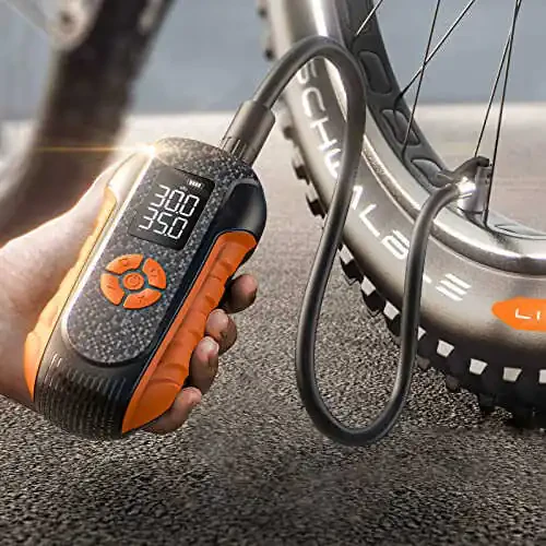 Rapid and Efficient Inflation: Experience lightning-fast and efficient tire inflation with our cutting-edge bicycle air pump. With an impressive maximum pressure of 150 PSI and a powerful airflow of 20L/Min, getting you back on the road in no time. The 2000mAh battery provides ~12min inflation at 25℃. Extreme temperatures (40℃) may reduce runtime by 50%. Pre-charge before critical use Compact and Portable Design: Designed for on-the-go cyclists, our compact and portable bicycle air pump is ingeniously crafted to be lightweight and easily portable. Its sleek and ergonomic design allows for hassle-free storage in your pocket, backpack, or bike bag, ensuring it's always within reach whenever you need it. 45cm hose length requires the pump to be within 40cm of the wheel hub. Large SUVs/trucks may need repositioning Versatile Compatibility for All Bikes, Motorcycles, Cars, and Balls: Our high-performance bicycle air pump boasts universal compatibility, Whether you need to inflate the tires of your bike, motorcycle, or car, or pump up like soccer balls, our pump effortlessly adapts to your inflation needs, providing a seamless and efficient experience across different inflatables. FOR CAR TIRES, we suggest only for emergency inflating use. turbocharged motor operates at 68-72dB (similar to vacuum cleaner) Emergency Power Bank and Flashlight: Our bicycle air pump is not just a tire inflator, it also serves as an emergency power bank and flashlight. Equipped with a built-in rechargeable battery, it provides a reliable power source to charge your devices in emergency situations. Additionally, the integrated flashlight ensures visibility and safety during nighttime or low-light conditions. Analog gauge has ±3PSI tolerance. For precision measurement, use with digital tire pressure monitor Durability and Reliability You Can Trust: Engineered with premium-grade materials, our bicycle air pump is built to withstand the demands of rugged terrains and unpredictable weather conditions. Its robust construction guarantees long-lasting durability, making it your reliable companion on every cycling adventure. Inflates bike tires (29×2.2) 0→35PSI in 2-3min. Car tires (205/55R16) 20→32PSI in 8-12min (emergency use only). Continuous use over 5min may raise surface temp to 45-50℃ (normal)
