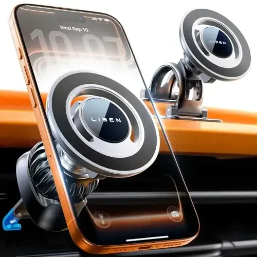 Elevate your driving experience with the LISEN for Magsafe Car Phone Holder. This versatile in-car phone holder is designed to securely and easily position your phone for optimal accessibility. Specifically designed for Magsafe compatible devices, this holder firmly keeps your phone in place while providing easy access to charging and other functions. Whether you use it on the dashboard or the ventilation grille, the LISEN car phone holder is the perfect solution to provide you with the most suitable viewing angle. Thanks to its patented design, it can be easily mounted on both flat and curved surfaces, and its 360° rotating head allows you to adjust your phone as you wish. With its powerful magnets and durable adhesive, you can rest assured that your phone is safe even on bumpy roads. The LISEN for Magsafe car phone holder is not just an accessory, but an investment that increases your driving safety. Whether you use the iPhone 16 series or older models, this holder is designed to provide you with a smooth and safe driving experience. In addition, this holder is also compatible with devices that do not have the Magsafe feature, offering you a wide range of use. Produced with LISEN quality, this product will serve you for years with its long-lasting and durable structure.