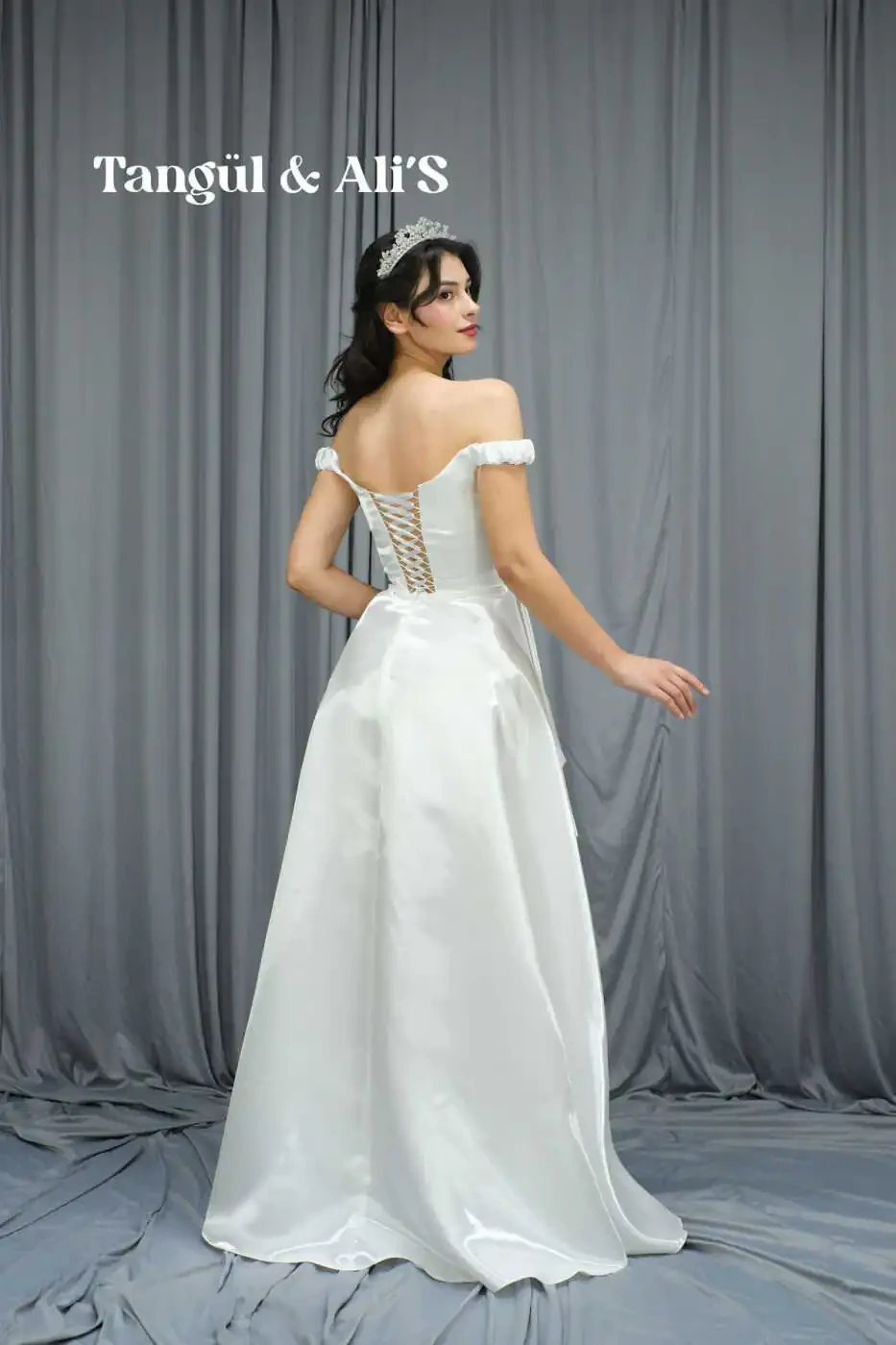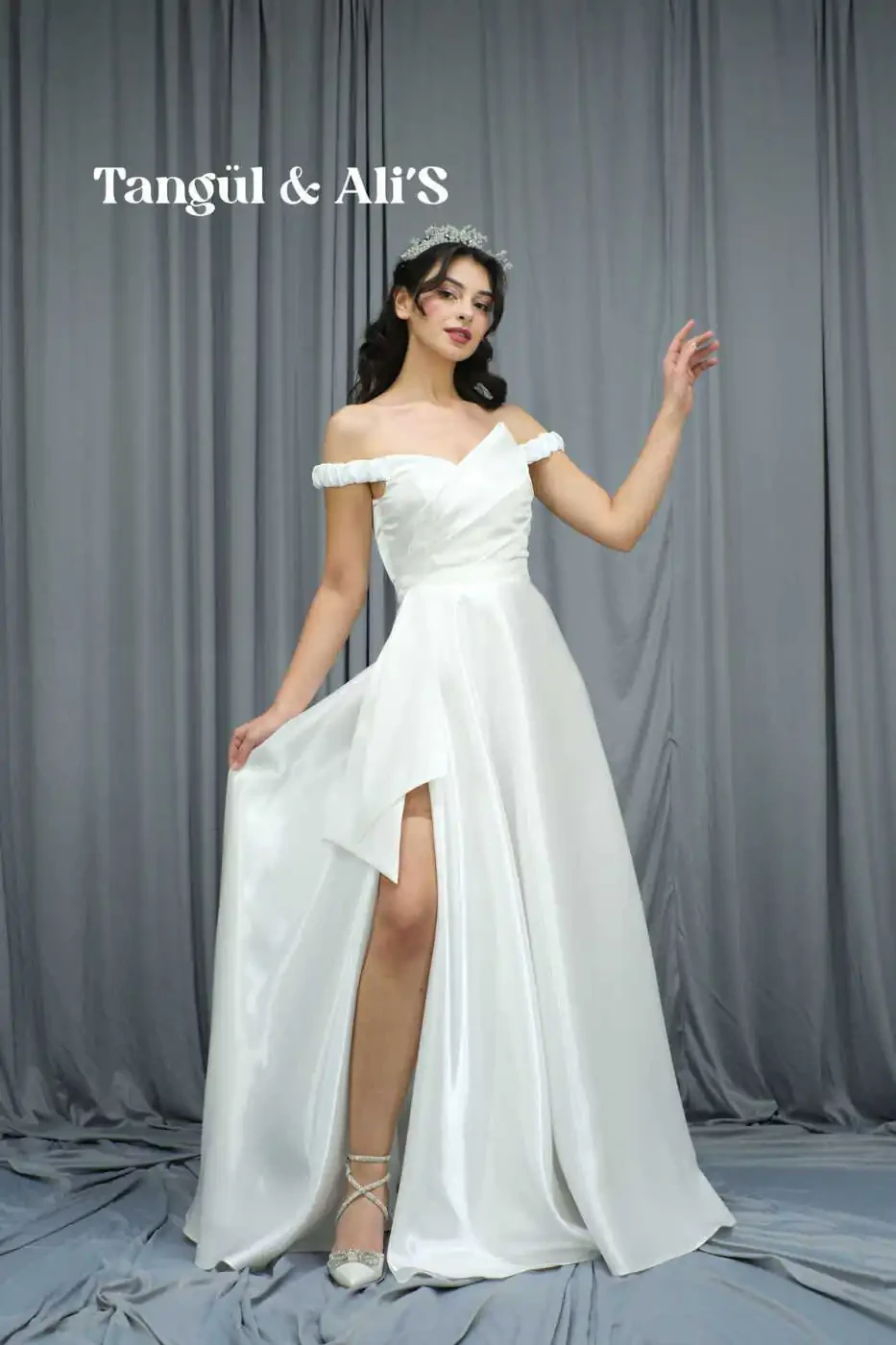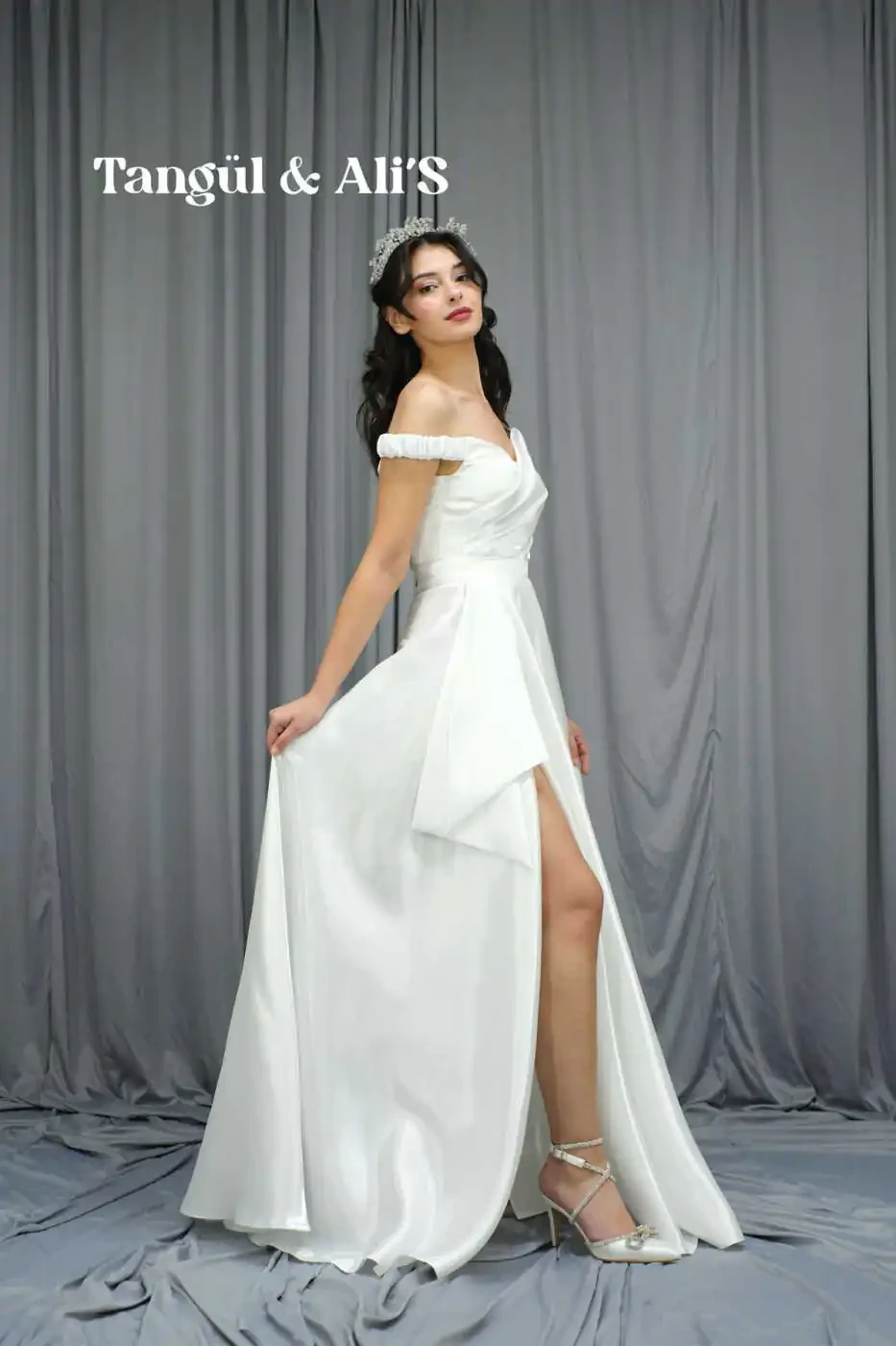 %100 Polyester, Saten kumaş, Astarlı, Drapeli, Maxi boy, Uzun kollu, Omuzları açıkta bırakan tasarım, Rahat kesim, Şık ve zarif tasarım.