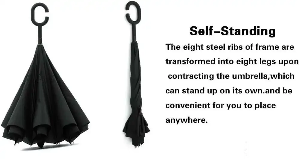 The LLanxiry Inverted Umbrella is the perfect solution to stay dry in the rain with its unique design and practical features. Its inverted structure ensures that water droplets fall outside the umbrella, not inside. This prevents your clothes from getting wet when getting in or out of a car. Additionally, its C-shaped handle allows you to easily hold the umbrella with one hand and carry your phone or bag with the other.