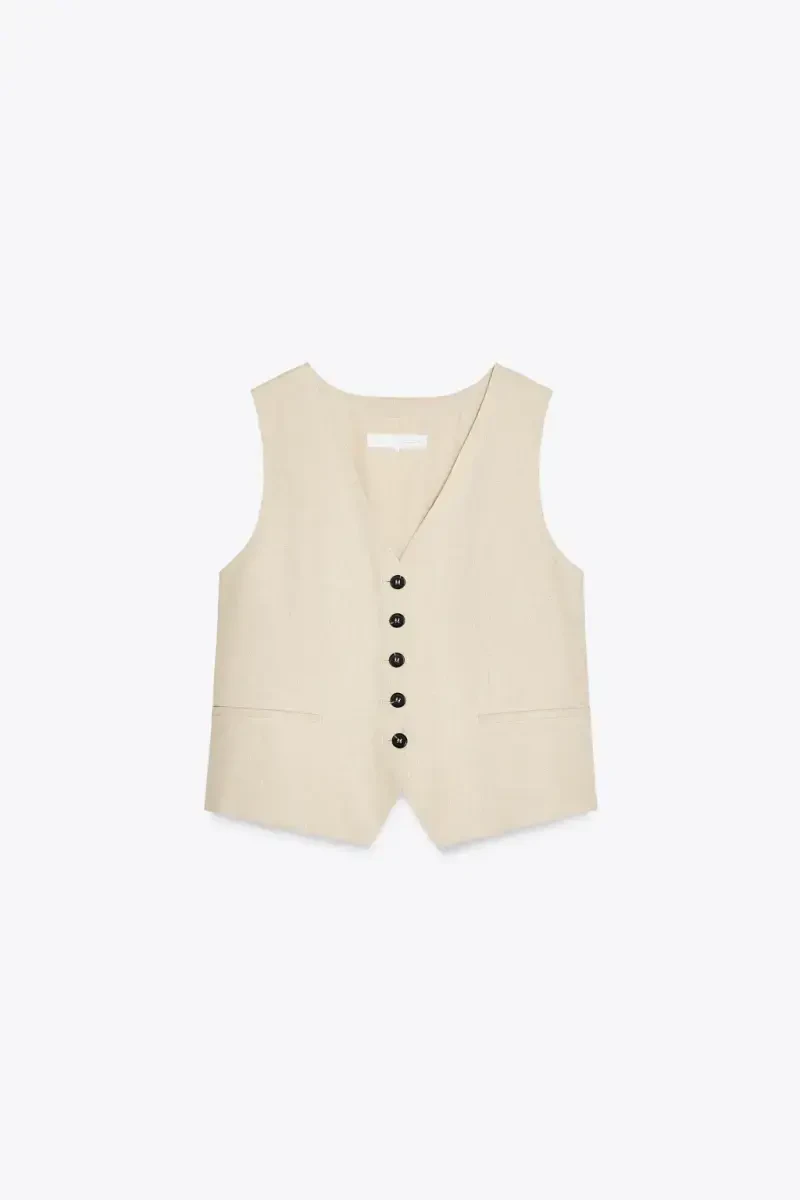 льняной жилет, жилет портного, светло-бежевый жилет, хлопковый жилет, жилет с V-образным вырезом, жилет на пуговицах, женский жилет, бежевый жилет, с льняной отделкой, стильный жилет