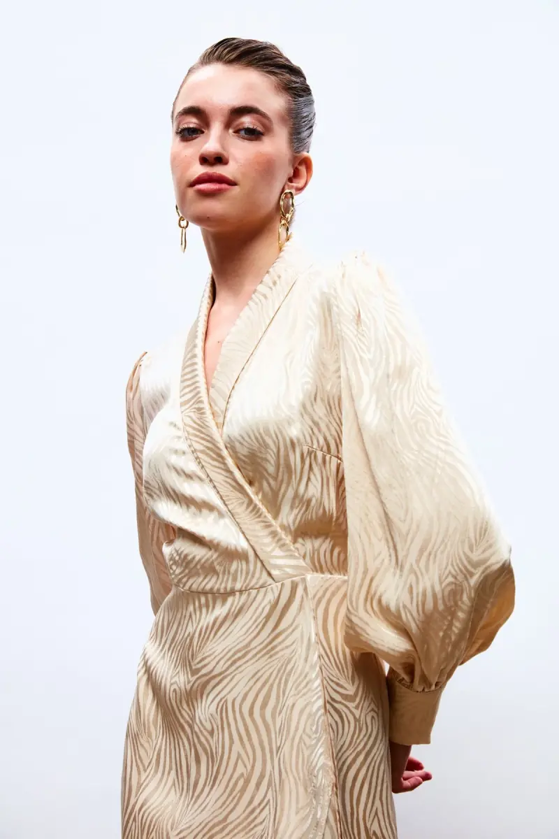 wrap dress, long dress, beige dress, stylish dress, elegant dress, women's clothing, dress models, special occasion dresses, casual dress