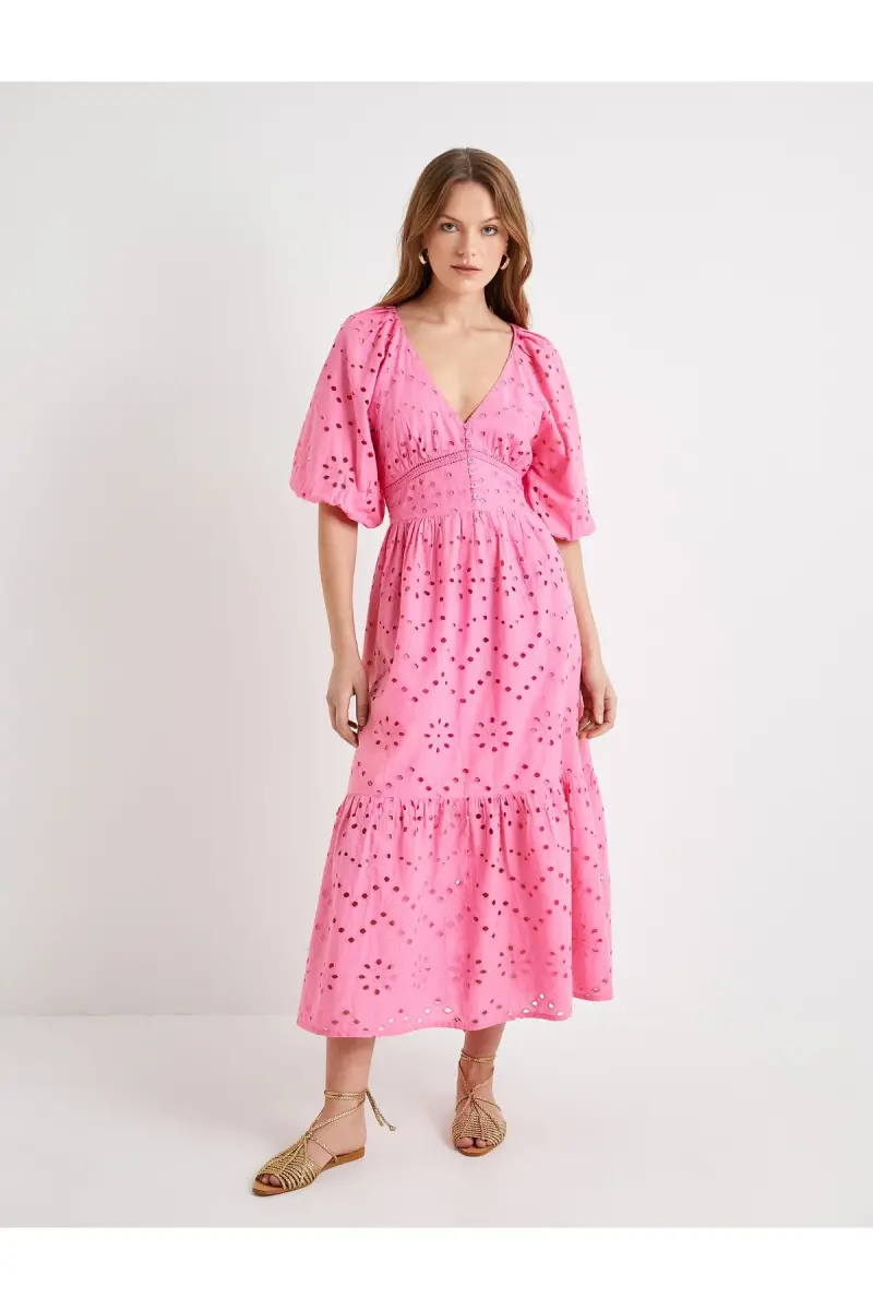 Eyelet Dress: Balloon Sleeve, Deep Neckline, Buttoned | Stylish and Comfortable