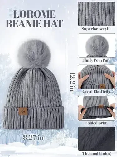 LOROME Women's Winter Beanie Hat Scarf Gloves Set, Fleece Knit Pom Pom Hat, Warm Neck Scarf, Touch Screen Gloves Winter GiftProduct DescriptionExperience style and comfort in cold winter days with the LOROME Women's Winter Beanie Hat, Scarf and Gloves Set. This comprehensive set is designed to keep you warm from head to toe and protect you from the adverse effects of cold weather. The knitted pompom beanie with soft fleece lining is not only a stylish accessory but also keeps your head and ears warm. The long and wide neck scarf protects your neck from wind and cold while adding an elegant touch to your outfits. Touch screen compatible gloves allow you to use your smart devices comfortably while keeping your hands warm. This set is ideal for both daily use and a perfect winter gift for your loved ones on special occasions. Produced with LOROME quality, this set offers long-lasting use and will be an indispensable part of your wardrobe with its color options suitable for every taste. If you don't want to compromise on your style and comfort while going out in cold weather, the LOROME Winter Beanie Hat, Scarf and Gloves Set is for you.Product Features* Warm and comfortable beanie knitted with fleece lining.* Stylish pompom design.* Long and wide neck scarf.* Touch screen compatible gloves.* High quality and durable material.* Different color options.* Provides full protection in winter months.* Suitable for daily use and special occasions.* A perfect winter gift option.* Protects head, neck and hands from the cold.Additional InformationThis set is ideal for anyone who enjoys spending time outdoors in the cold winter months. Whether you're taking a stroll in the city or hiking in a snowy mountain, the LOROME Winter Beanie Hat, Scarf and Gloves Set will always keep you warm and stylish. Please follow the washing instructions for the long life of our product. Hand washing or machine washing at low temperature is recommended. Avoid using bleach. Think about both your comfort and elegance while enjoying the winter, be prepared for winter with LOROME!