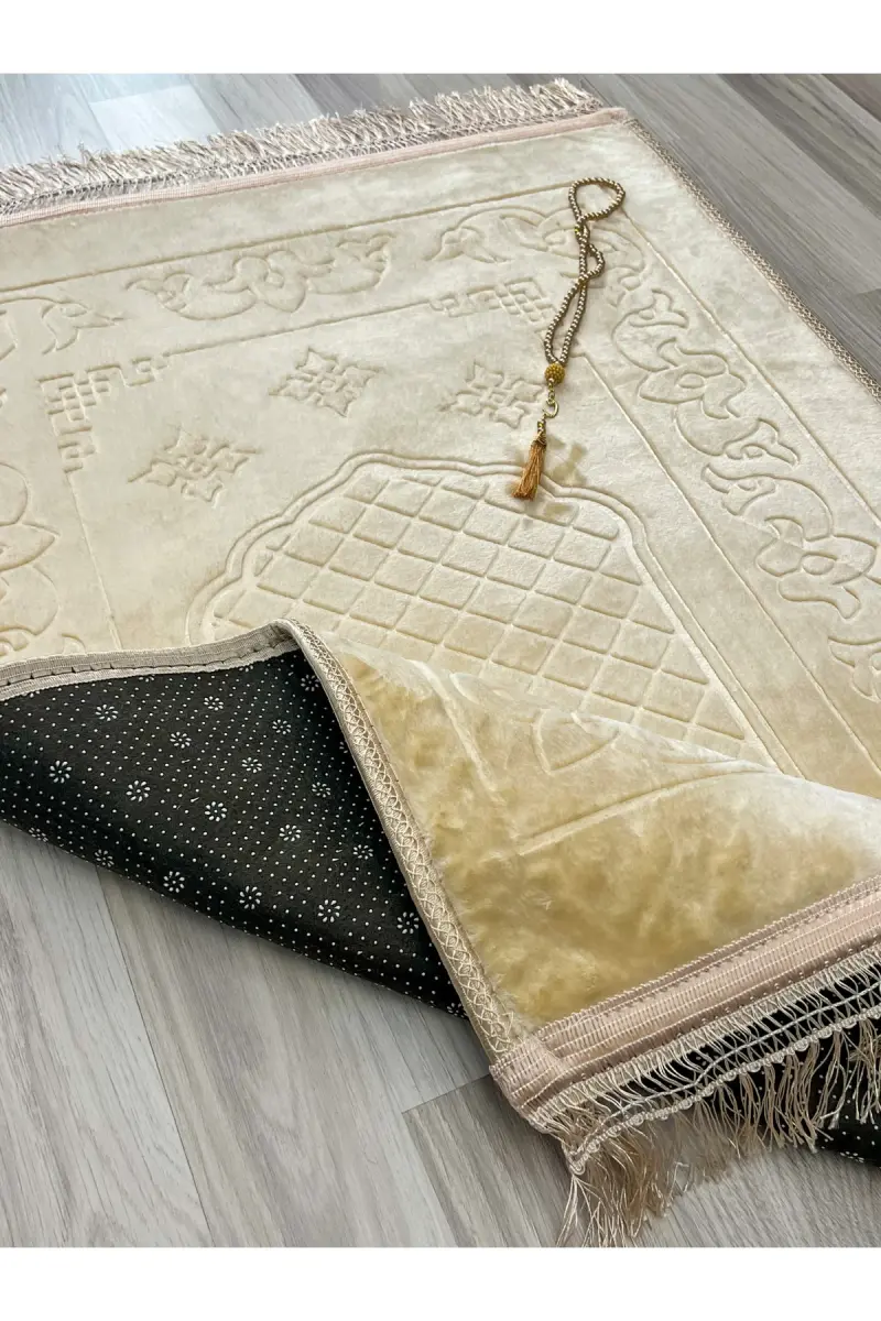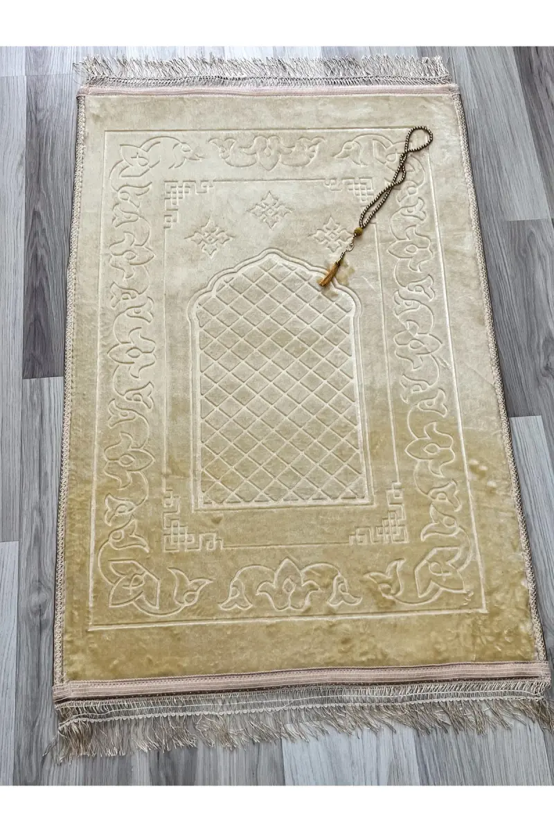 Lüks Kalın Yumuşak Peluş Kaymaz Taban Özellikli Hediyelik Çeyizlik Seccade Tesbih-Kahverengi
