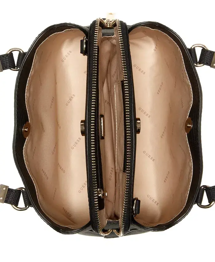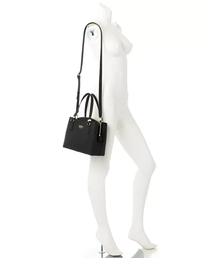 GUESS Lyndi Small Triple Compartment Girlfriend Satchel - Black is a bag that combines elegance and functionality, and is a candidate to be an indispensable accessory for modern women. This elegant design, which will accompany you in every environment from your daily use to your special invitations, will both complement your style and allow you to carry your belongings in an orderly manner. This bag, made of high quality artificial leather PVC material, offers long-lasting use without sacrificing its elegance. Lyndi Satchel has ideal dimensions with its 10.5" width, 8.75" height and 4.5" depth. The functionality of its internal volume stands out with its three-compartment structure. The zippered part in the middle compartment is specially designed to safely store your valuables. The 1 zippered pocket and 3 open pockets inside the bag help you organize everything from your phone to your key chain, from your make-up materials to your cards. Thanks to its 6" long carrying handle, it can be easily carried by hand, and thanks to its 22.75" long detachable strap, it can be used on your shoulder or diagonally. Pale shiny gold-colored metal accessories add a sophisticated touch to the bag's design, while the footed base structure ensures that the bag stands upright and prevents it from touching surfaces, making it more durable. The magnetic snap closure system ensures that the bag can be easily opened and closed, while also guaranteeing the security of your belongings. Lyndi Satchel, which is very easy to carry with its weight of 2.06 lbs, is wide enough to easily fit all phone models and even an iPad. Whether you are going to a business meeting, meeting with your friends, or attending a special dinner, GUESS Lyndi Small Triple Compartment Girlfriend Satchel - Black is the perfect choice to complement your style and accompany you at all times.
