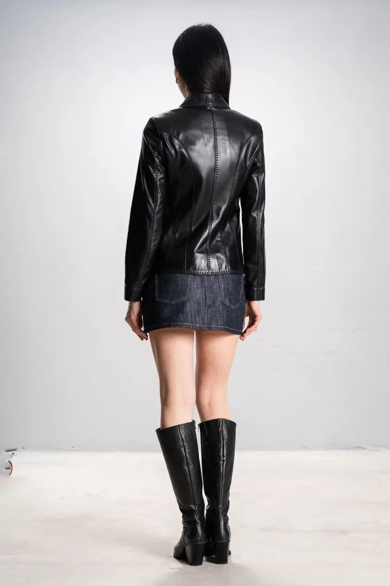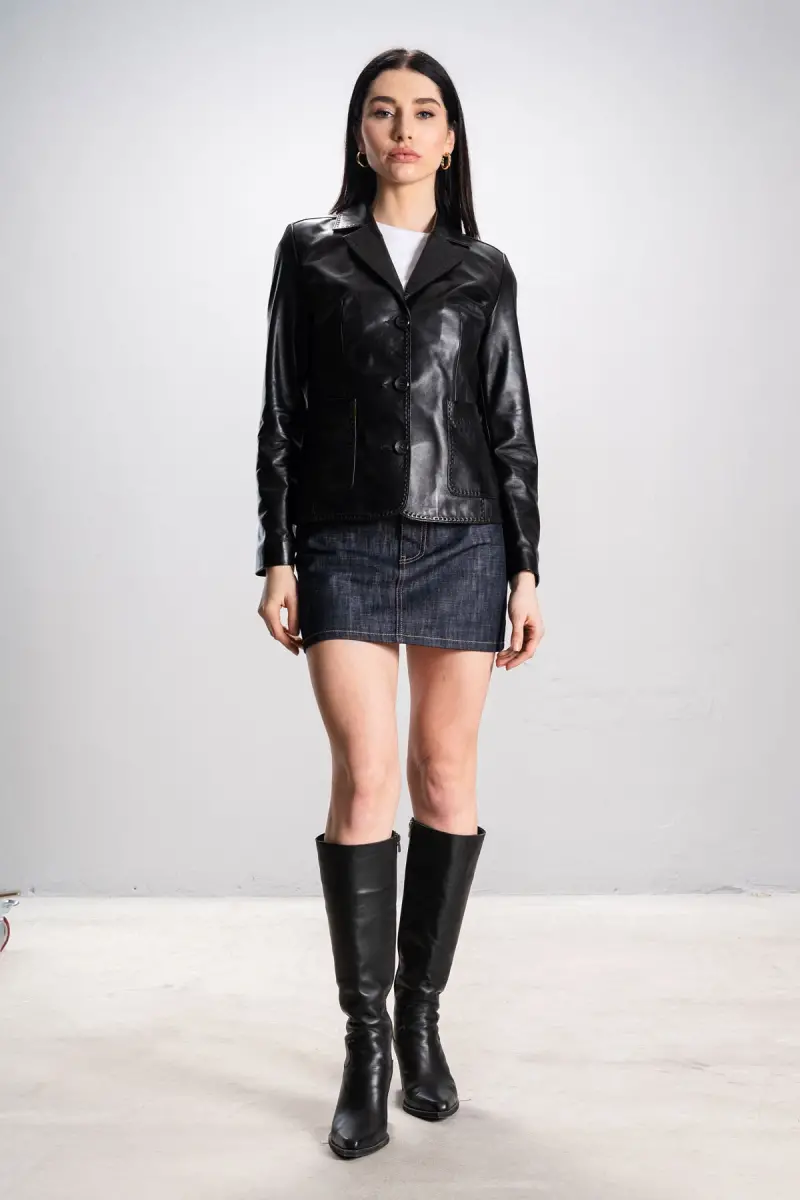 Lyon Kadın Üç Düğmeli Torba Cepli Hakiki Deri Blazer Ceket Siyah-Siyah
