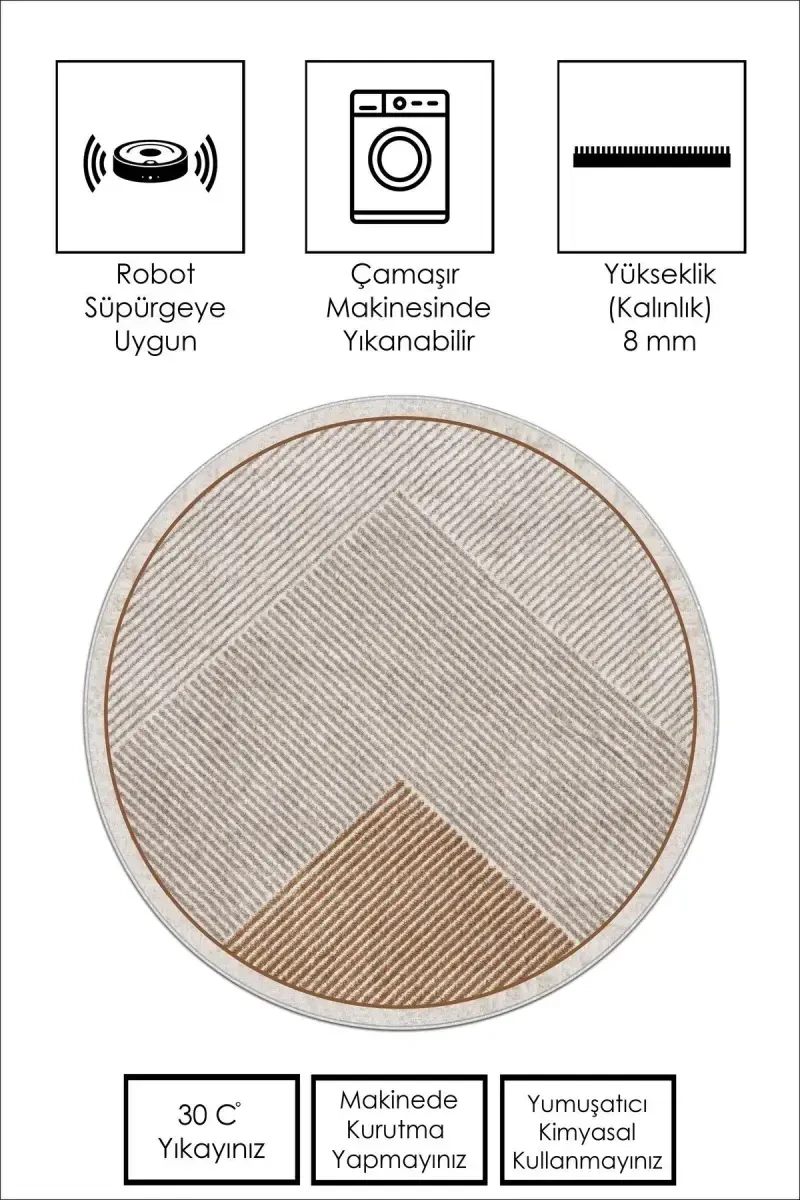 The Machine Washable Non-Slip Base Stain-Resistant Round Living Room Carpet and Kitchen Carpet, offered with Lavita Home quality, is a practical and stylish option that will change the atmosphere of your home. This modern carpet stands out not only with its aesthetic appearance but also with the practical features it offers. It adds a sophisticated touch to your living spaces with its silky texture and digitally printed patterns. Thanks to its round design, it adds a different dimension to the geometry of your room and creates a harmonious whole with your furniture. Ideal for frequently used areas such as living rooms and kitchens, this carpet prioritizes safety with its non-slip base. You can move comfortably on it and allow your children and pets to play safely. Thanks to its stain-resistant feature, it is resistant to accidents that may occur in daily use and can be easily cleaned. The ability to be washed in the washing machine at 30° makes carpet maintenance extremely practical. Being able to be washed without spinning ensures the longevity of the carpet. This carpet, which has antistatic, antiallergic and antibacterial properties, is an ideal choice, especially for those with allergies and those with sensitive constitutions. It does not dust or shed, thus providing a hygienic environment in your home. Thanks to its heat insulation feature, it keeps your feet warm on cold floors and contributes to energy saving. Thanks to its light structure, it can be easily transported and used in different rooms. This product, produced with new generation modern carpet technology, offers a great advantage compared to heavy and difficult to clean carpets. You can use it safely as it does not contain substances harmful to nature and human health, and does not contain carcinogenic substances. Suitable for use in all four seasons, this carpet offers a comfortable user experience by keeping you cool in summer and warm in winter. This carpet, produced with Lavita Home quality, will complement the decoration of your home and increase your quality of life. When choosing the size, do not forget to measure the area you will use with a meter in terms of width and length. (Our measurements are width x length.) All our designs are registered by TPE and all of our products are manufactured with the same quality. Experience both elegance and comfort with this carpet.