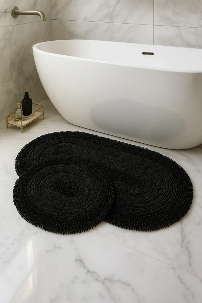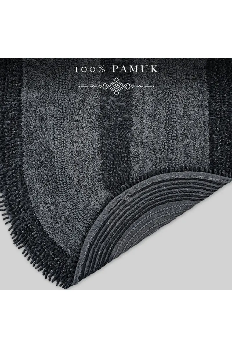Macoroni Oval Siyah 2'li Banyo Paspası Seti %100 Pamuklu Banyo Halısı Klozet Takımı-Siyah