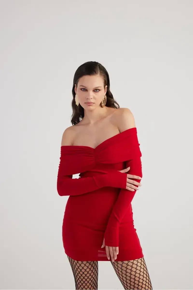 Платье с воротником "Мадонна", красное платье, мини-платье, платье на подкладке, платье из полиэстера, хлопковое платье, вырез "кармен", обычный крой, облегающее платье, Holly Lolly