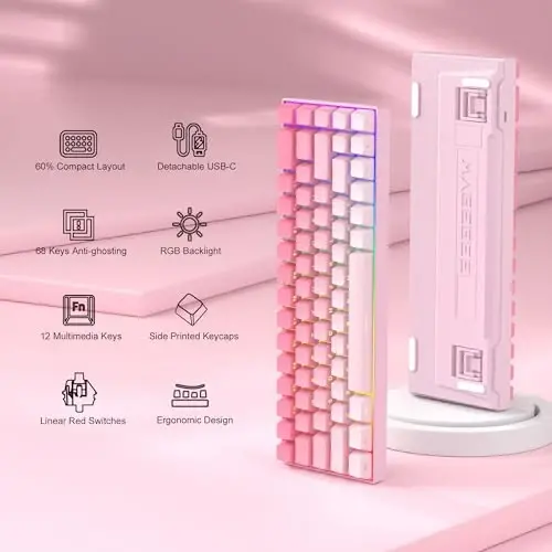 Mini portable 60% compact layout: MK-BOX is a 68 keys mechanical keyboard have cute small size, but with separate arrow keys and F1-F12 multimedia shortcut keys you need, can use it for gaming or work while saving space. Cool RGB backlit gaming keyboard: a wide choice of backlight effect and color, press Fn+ | can toggle about 16 backlit modes, include static and dynamic, press Fn+ ↑↓ ←→ can control backlit brightness and speed. users can adjust light effect according to their preferences for optimal illumination. Mechanical linear red switches: characterized for being linear and smoother, slight key sound has no paragraph sense with minimal resistance, but fast action without a tactile bump feel which makes it easier to tap the keyboard. Unique side-printed mini keyboard: these side-engraved ABS keycaps take double injection molding which are more durable without fading. keyboard supports both Win/Mac, can works perfectly on all kinds of devices. Full anti-ghosting 60% keyboard: all 68 keys are no conflict, stylish gradient pink color design, two-step kickstand adjustable typing angle and detachable usb-c cable, both practical and beautiful.